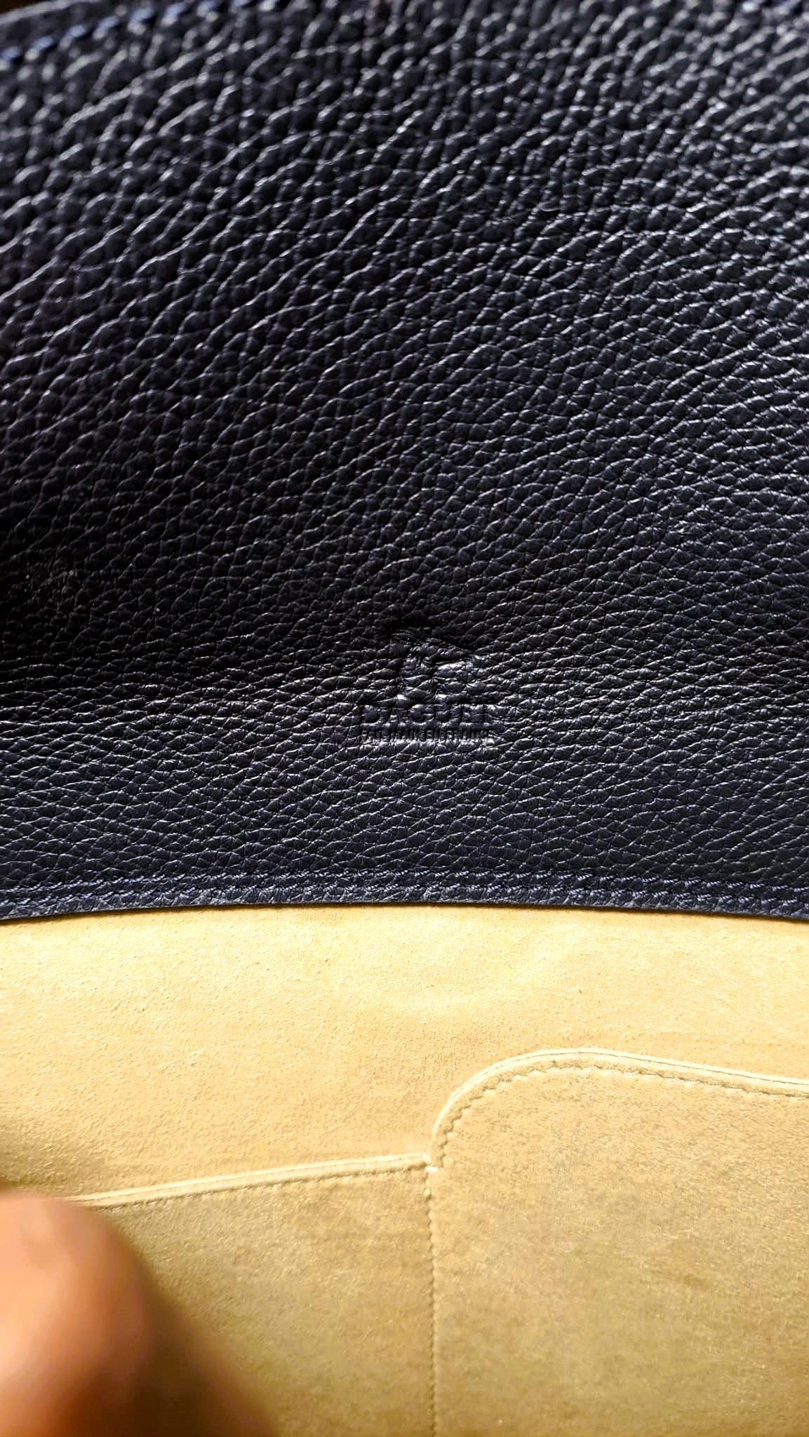 Design Details: Features a secure flap closure with a single snap button and eye-catching silver-tone hardware. The iconic round tan leather charm with the Daguet logo in a signature accessory featuring the brand's logo (a young deer or brocket) is attached for an authentic touch. The interior has a pebbled leather flap featuring an embossed young deer signature logo and 2 pockets. The creamy beige interior is made of suede or a soft leather lining.