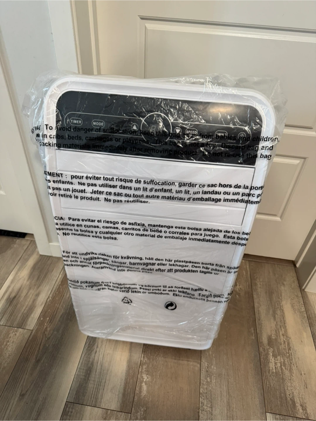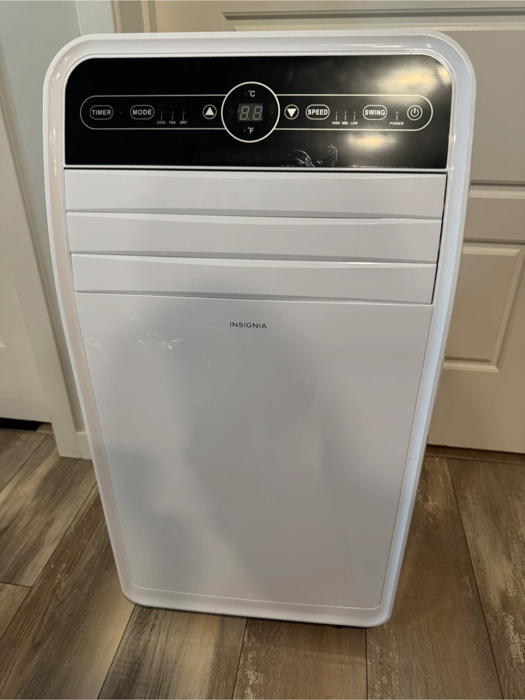 This is a portable air conditioner from Insignia. It has timer, mode, speed, and swing functions. The unit displays temperature in Celsius and Fahrenheit. It's white in colour.