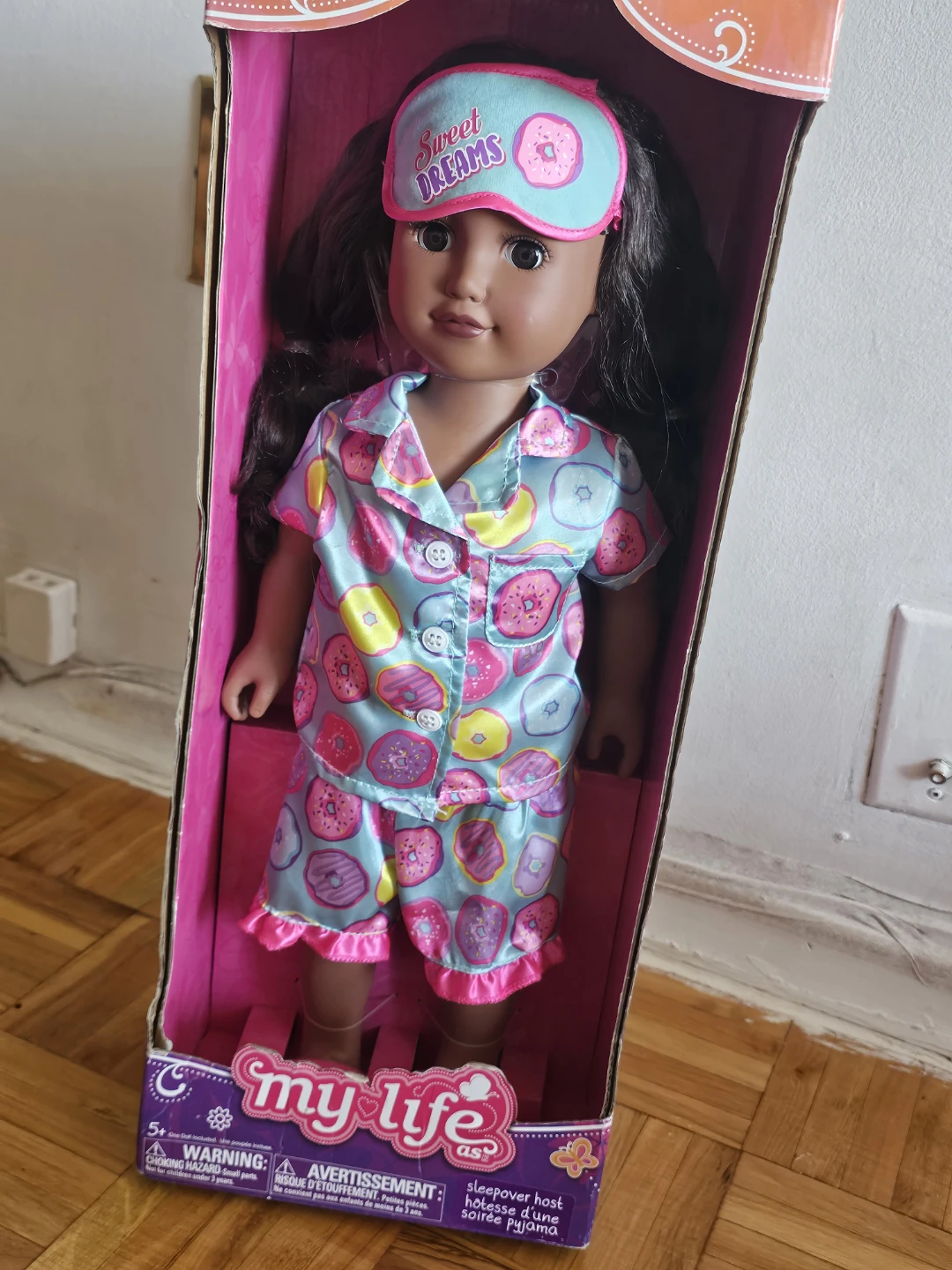 Selling this beautiful 18-inch My Life As doll. She is ready for a pajama party with her cute donut-patterned outfit and matching eye mask! 🍩✨