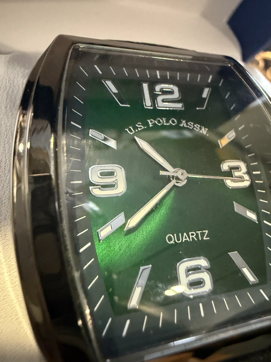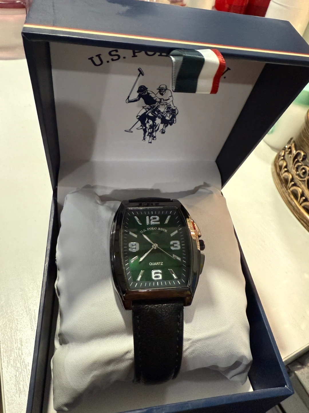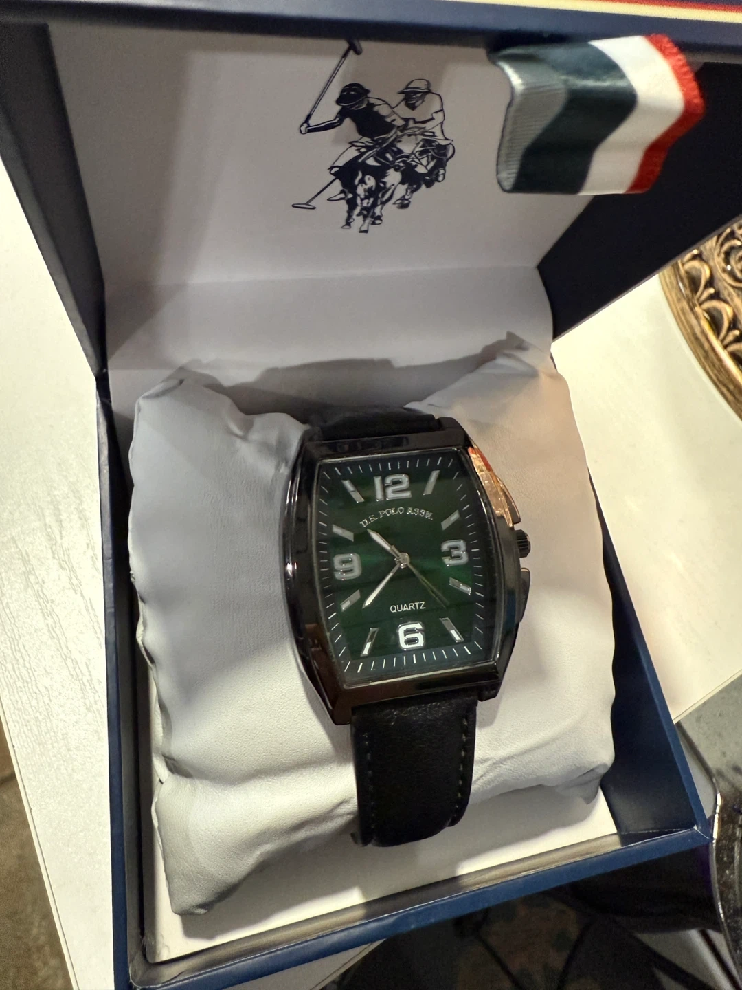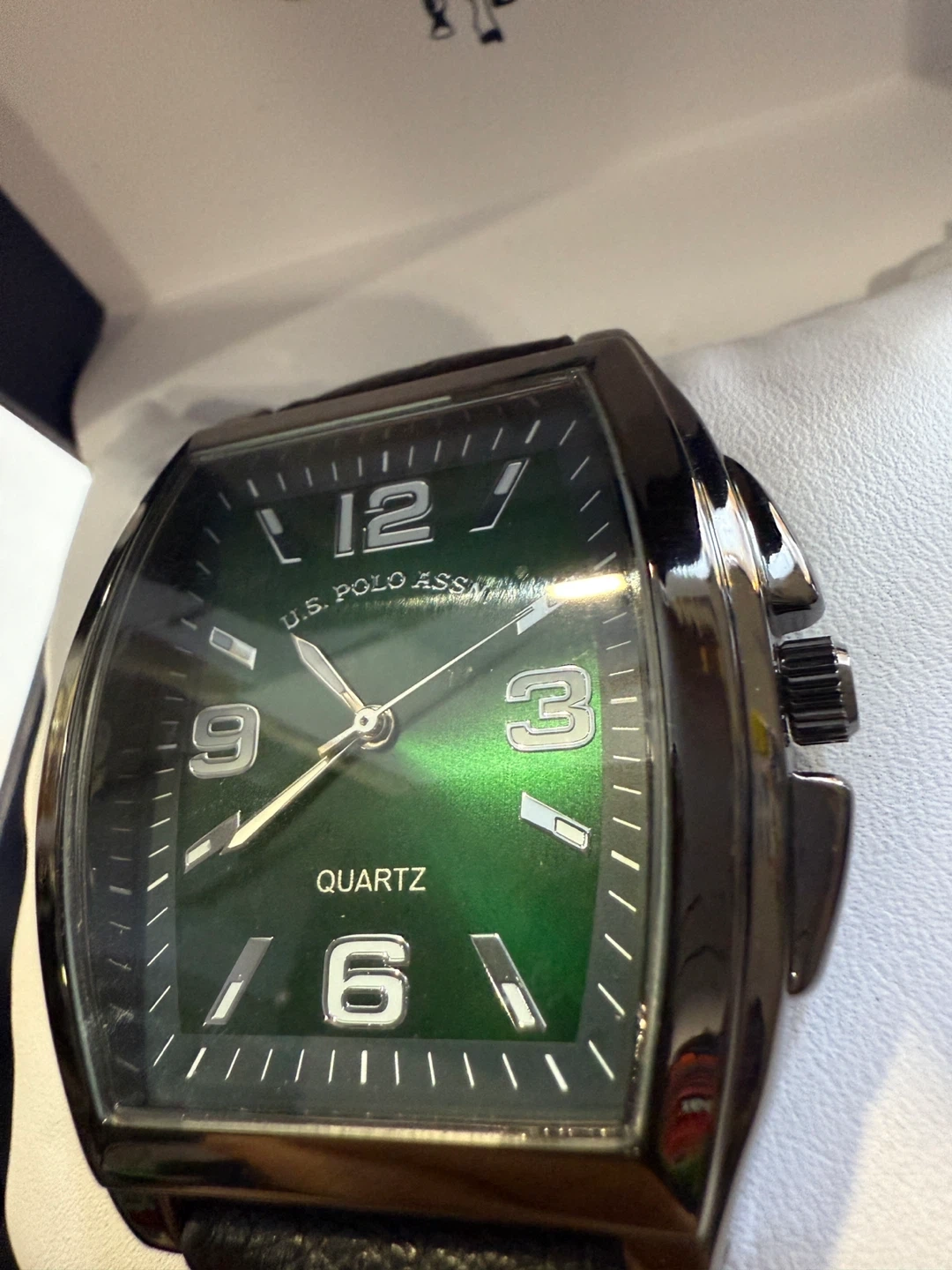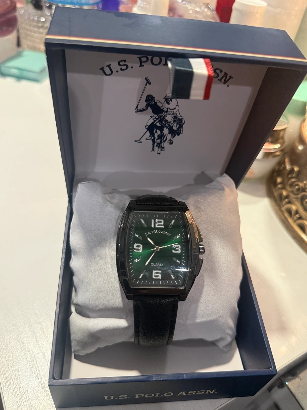 Selling a U.S. Polo Assn. quartz watch with a striking green face! It comes in its original box and is in great condition. The watch features a classic design with clear numerals and a comfortable band. Perfect for everyday wear or as a gift!