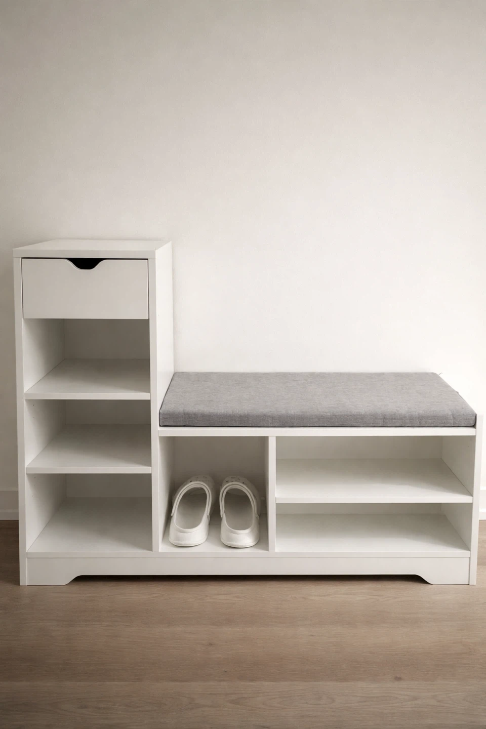 Includes shelves for shoes and a drawer for small items.