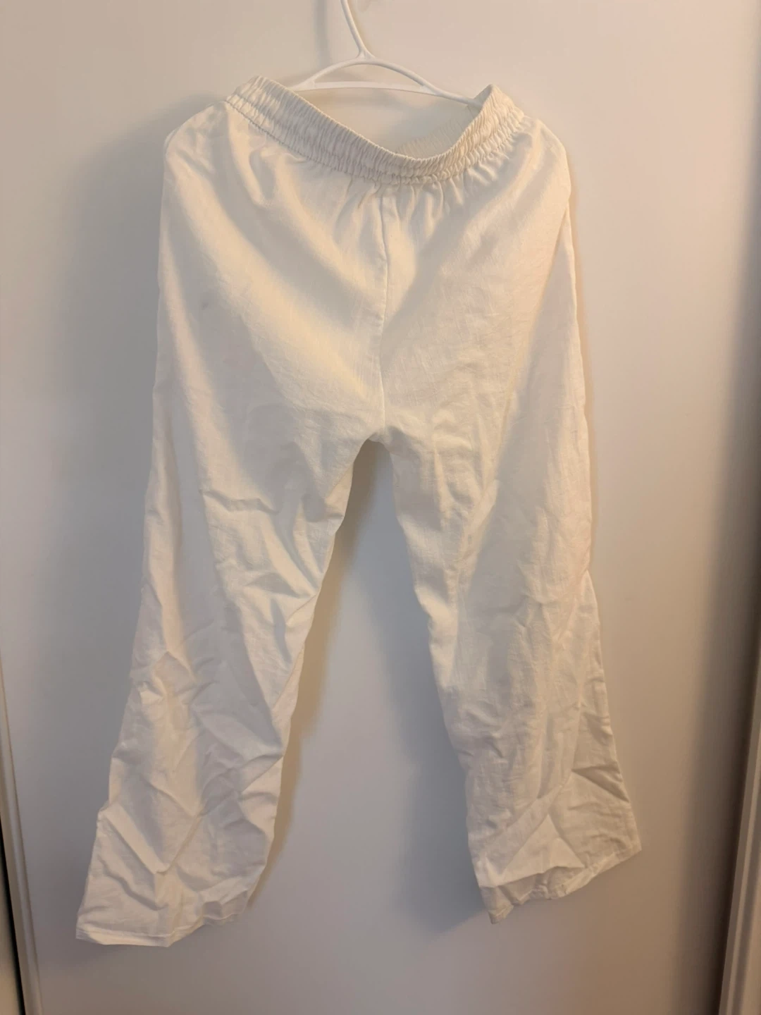 Comfy white linen pants with an elastic waistband and drawstring. They're perfect for lounging around or casual wear. Made of a breathable linen blend.