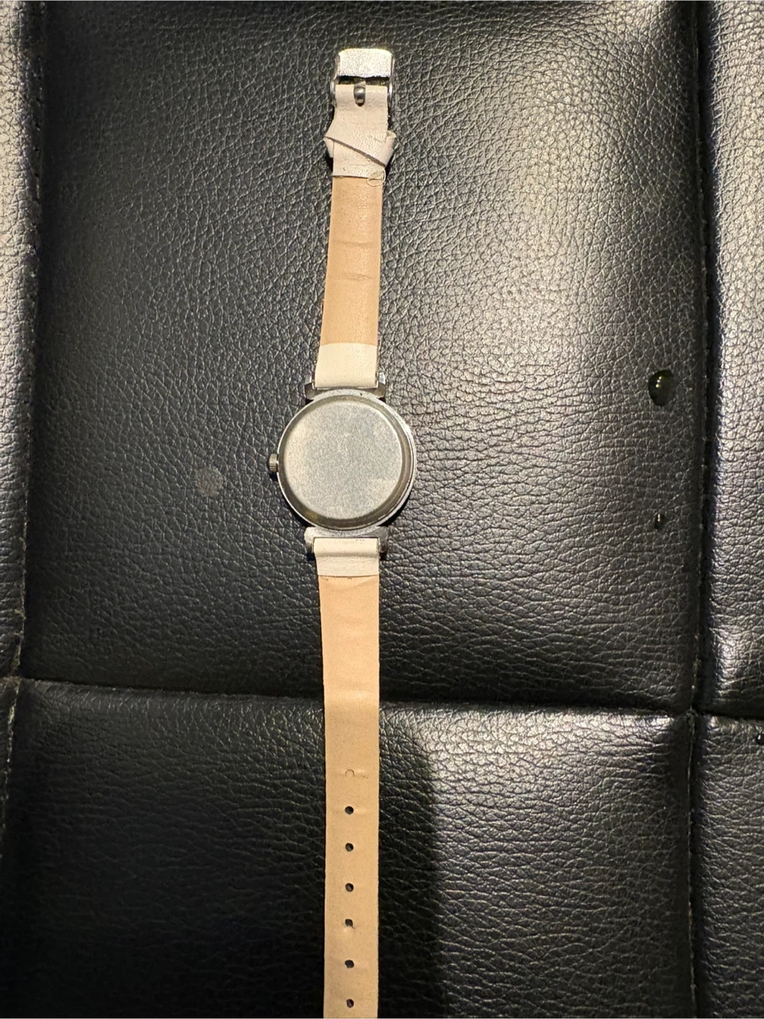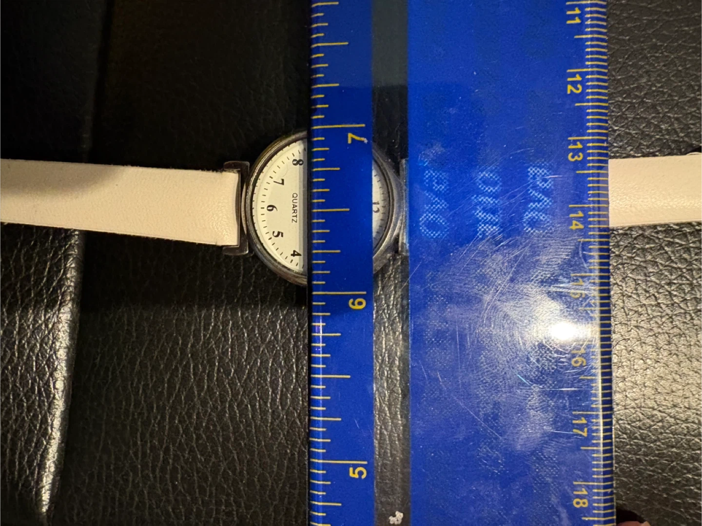 This is a white quartz watch with a leather strap. The watch face is round with black numbers and hands. It measures approximately 1 inches across the watch face. The strap is adjustable.