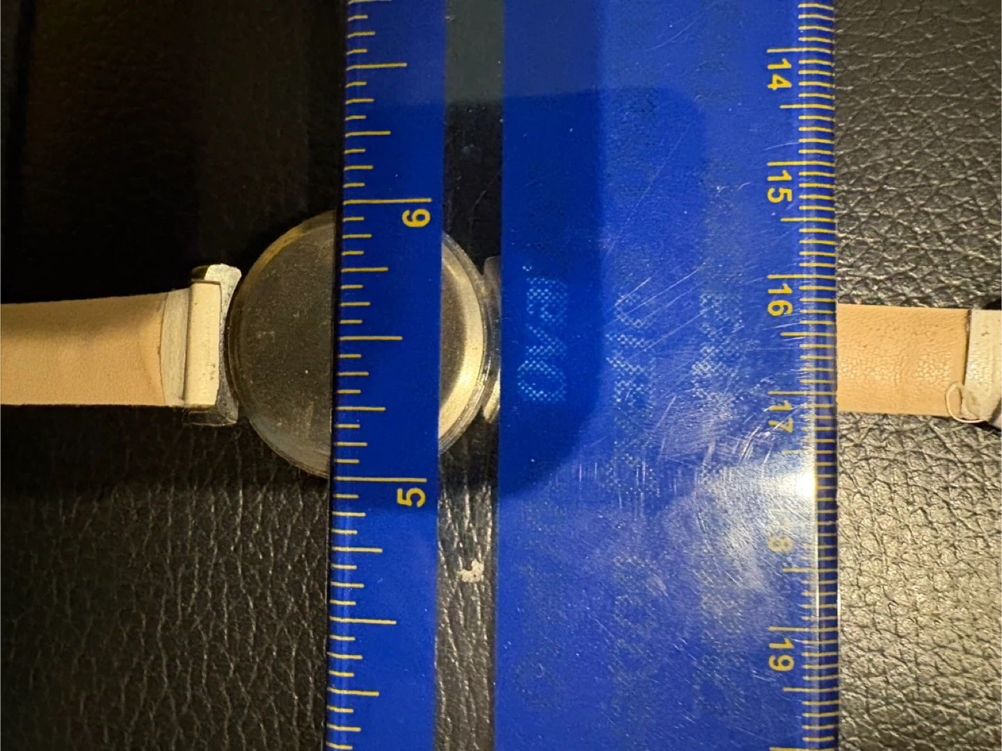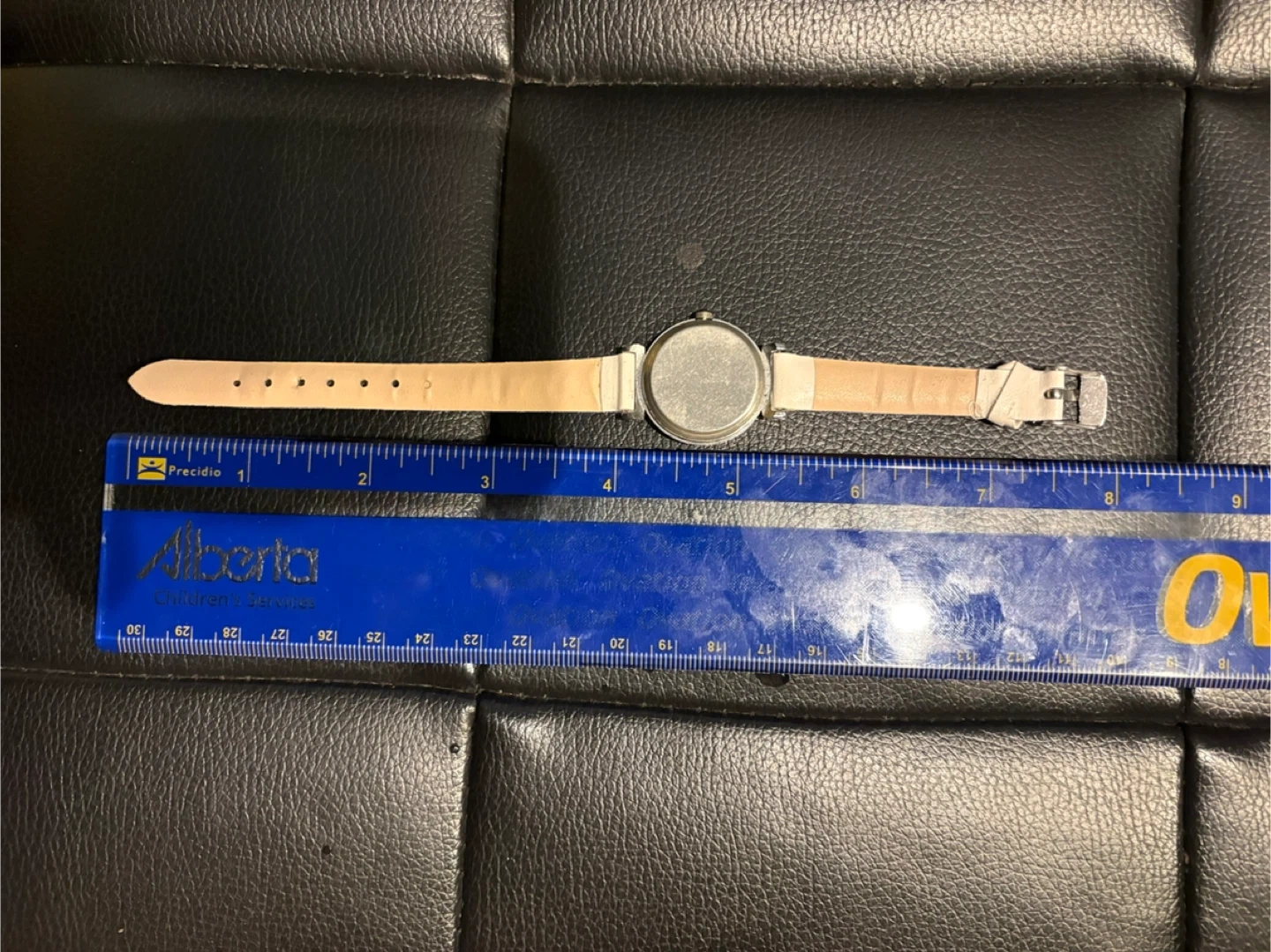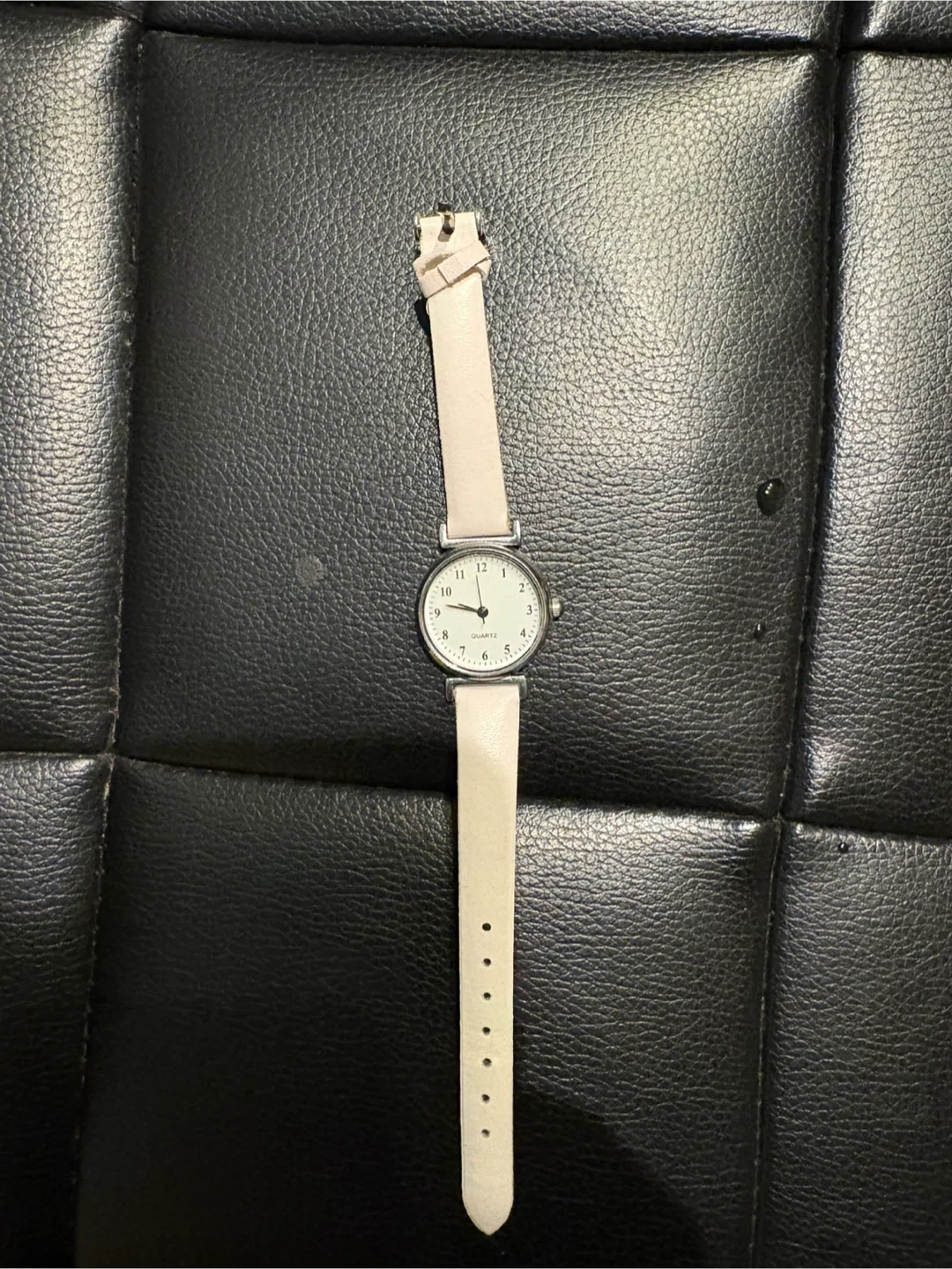 This is a white quartz watch with a leather strap. The watch face is round with black numbers and hands. It measures approximately 1 inches across the watch face. The strap is adjustable.
