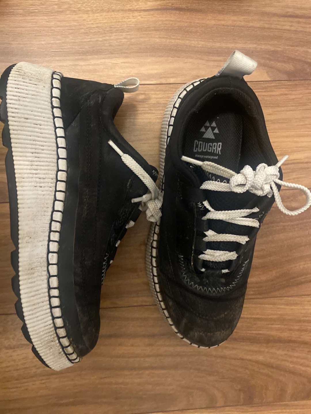 Black Cougar waterproof sneakers for women. These shoes feature a thick platform sole and white laces. They're ready for any weather! Size 6