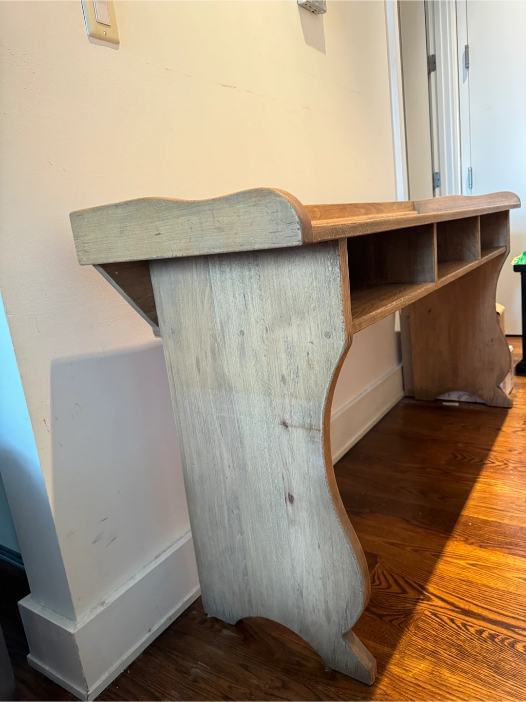 Pottery Barn solid wood console table with a natural finish. It features a long, flat top with a raised edge and a shelf divided into four compartments underneath. Its curved legs give it a classic look. It's perfect for entryways or narrow spaces! Great condition!