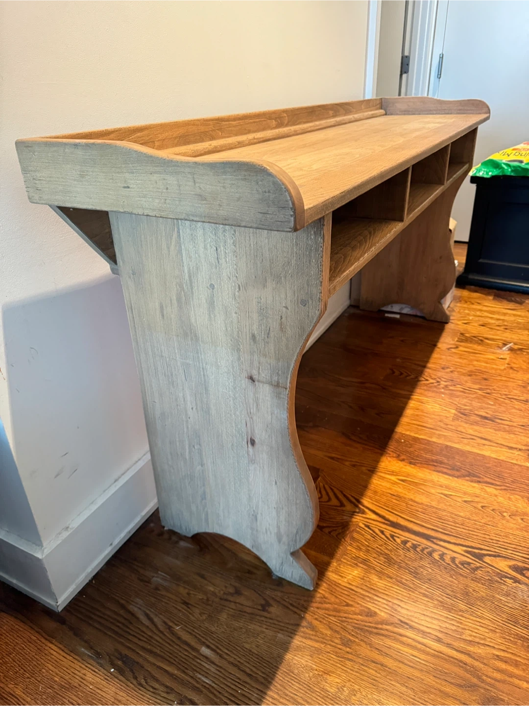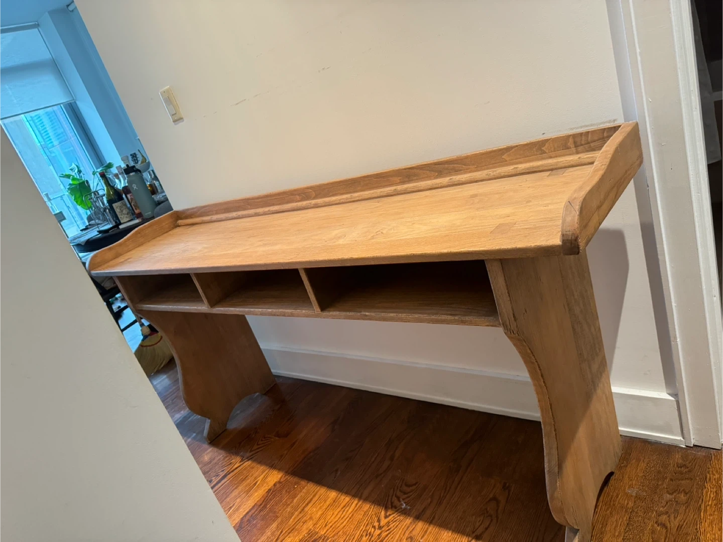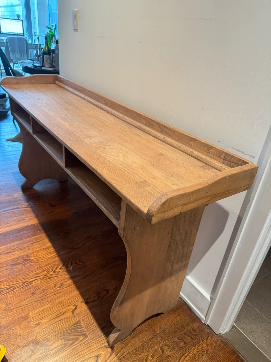 Pottery Barn solid wood console table with a natural finish. It features a long, flat top with a raised edge and a shelf divided into four compartments underneath. Its curved legs give it a classic look. It's perfect for entryways or narrow spaces! Great condition!