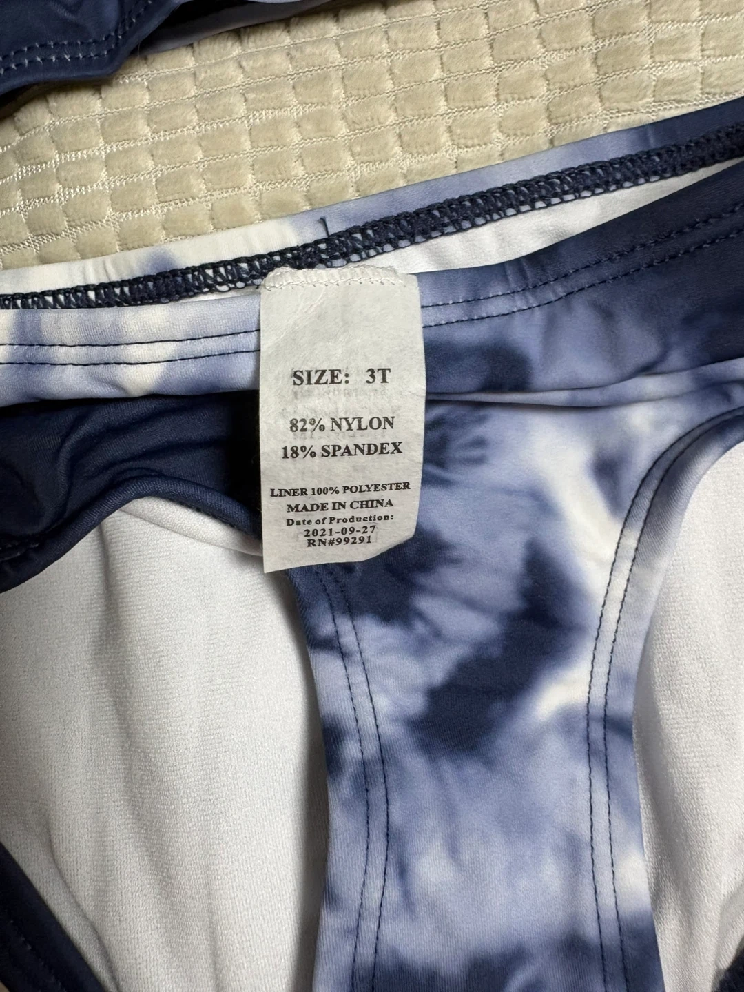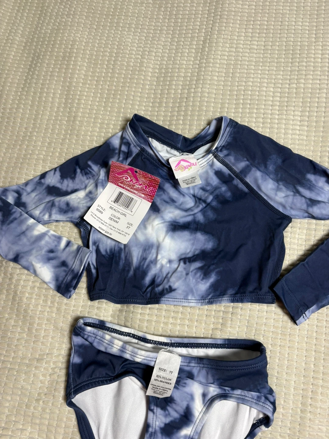 This Kanu Surf "Beach Girl" rashguard swimsuit set features a tie-dye pattern in denim blue and white. It's made of 82% Nylon and 18% Spandex with a 100% Polyester liner. This set is perfect for a day at the beach or pool!