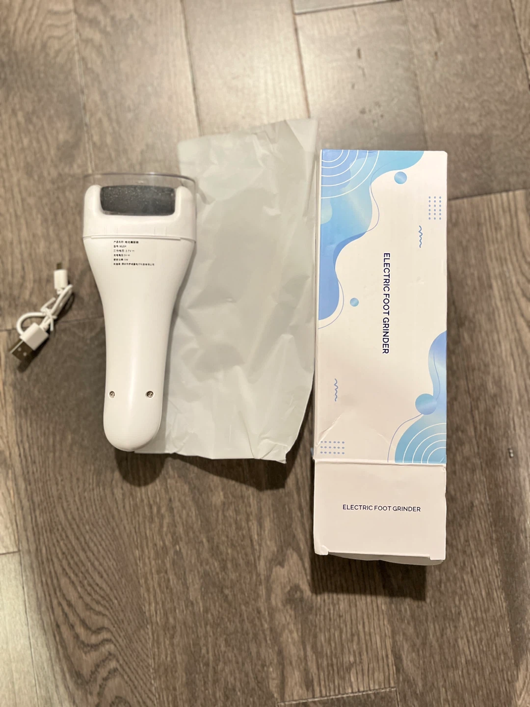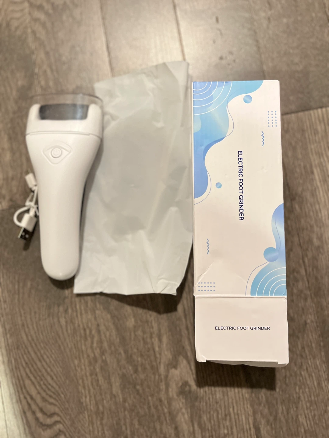 This is an electric foot grinder. It's white and comes with a USB charging cable. Includes original box and packaging.