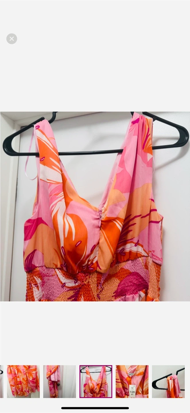 A vibrant floral maxi dress featuring a V-neckline and a cinched waist. It's made of a lightweight, flowy fabric perfect for warmer weather. This dress is great for casual outings or a summer event!