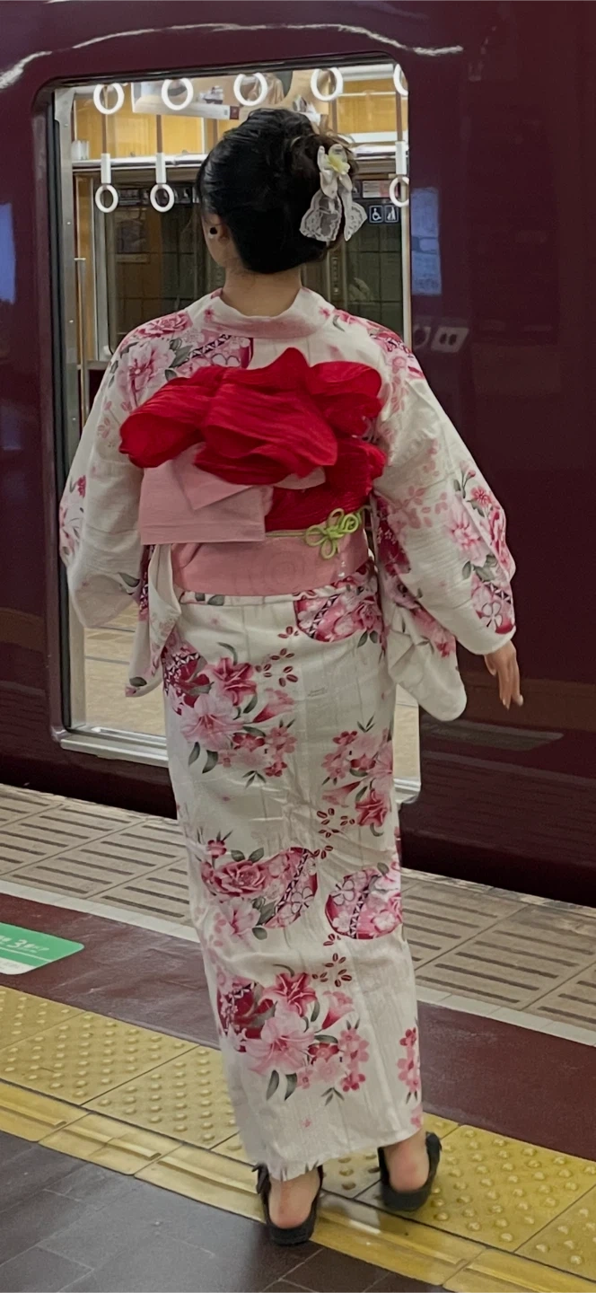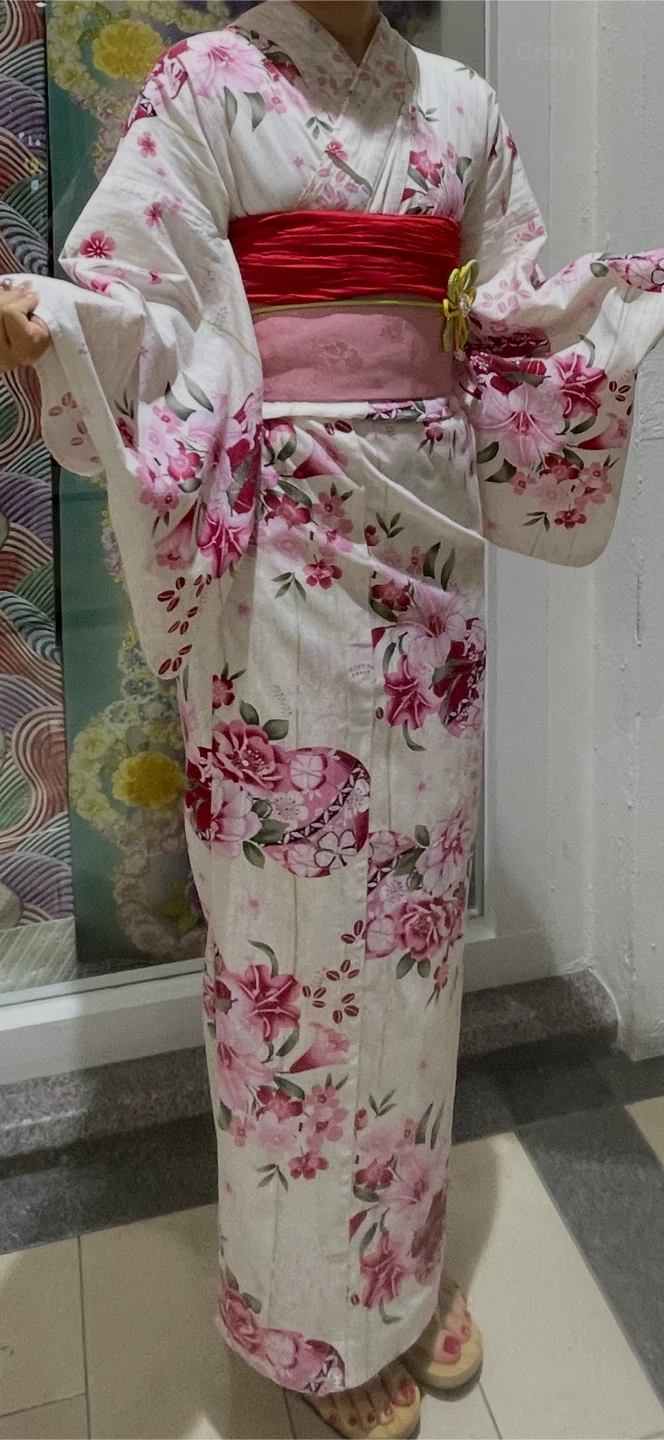 Beautiful white yukata with a vibrant pink and red floral pattern. It features wide sleeves and a traditional obi sash. This garment is perfect for summer festivals or cultural events. Includes traditional matching shoes too.