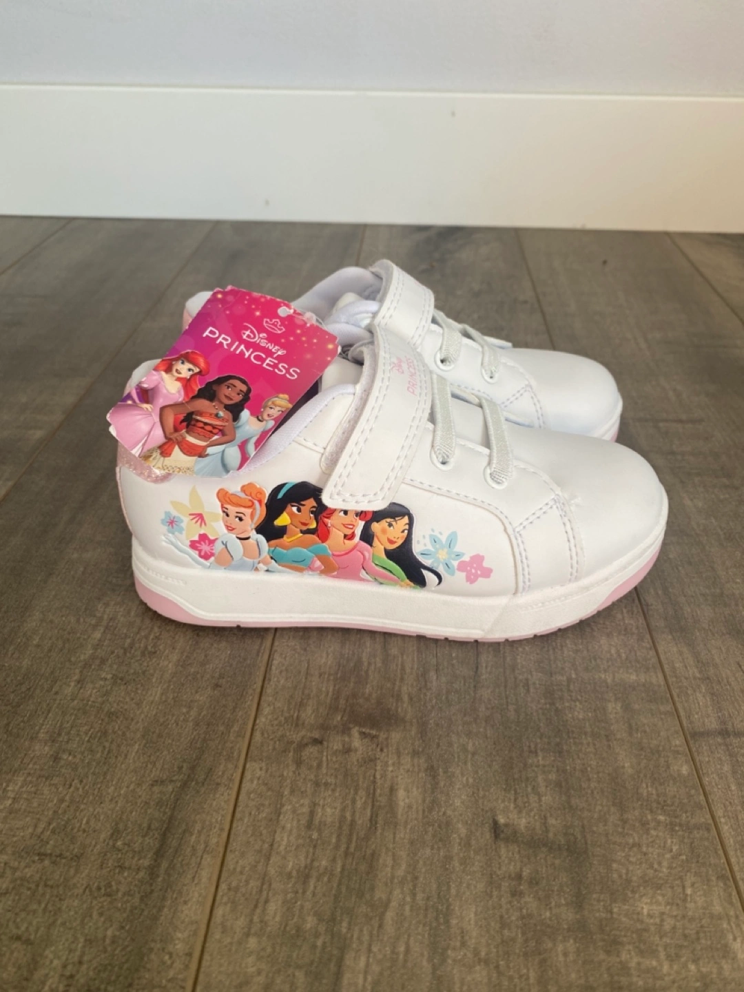 Cute white Disney Princess sneakers with hook-and-loop straps for easy on and off. Features several princesses printed along the sides. Rubber soles are pink.