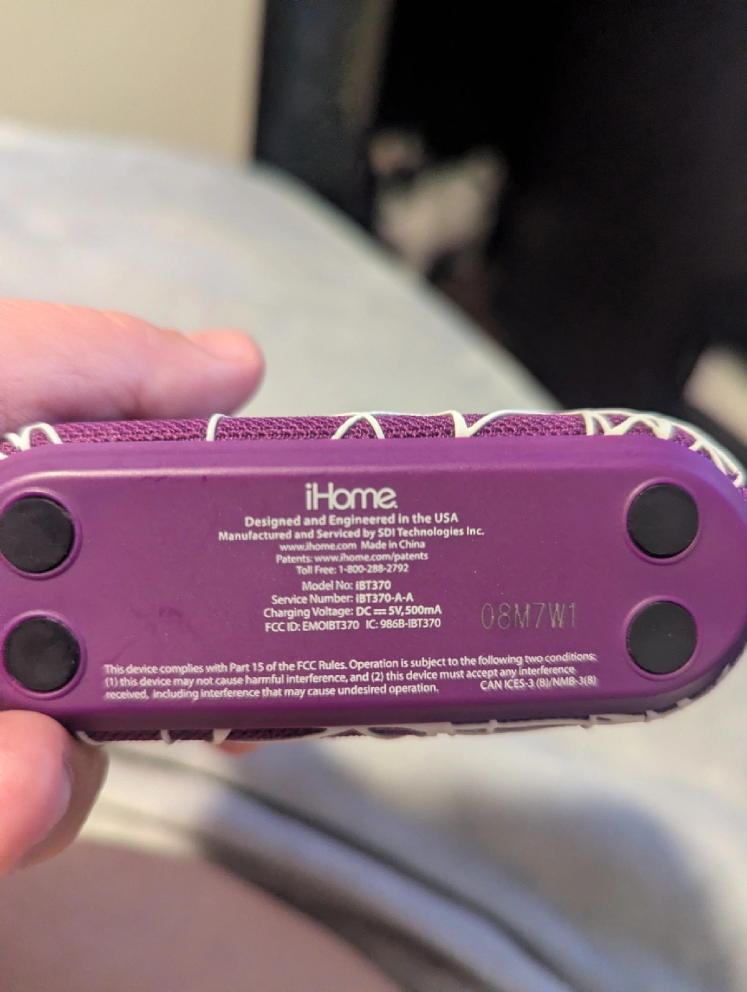 58Selling a cute iHome iBT370 speaker in purple! It's in great shape and ready to play your favourite tunes. This speaker is designed and engineered in the USA. Model number: iBT370