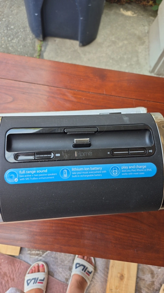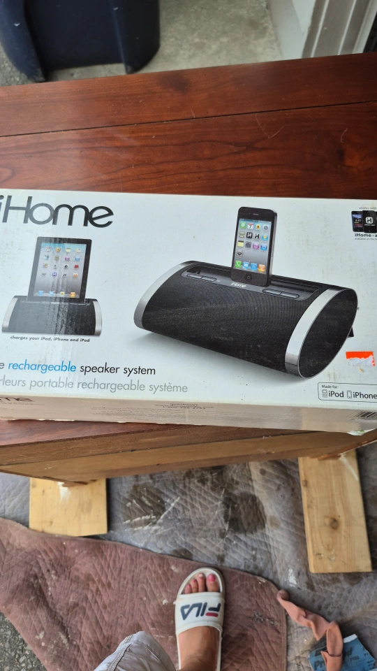 64Selling an iHome rechargeable speaker system! It's perfect for charging your iPod, iPhone, or iPad and taking your music anywhere. It has full range sound with SRS TruBass enhancements, a lithium-ion battery, and lets you play and charge your device. Works with most cases!