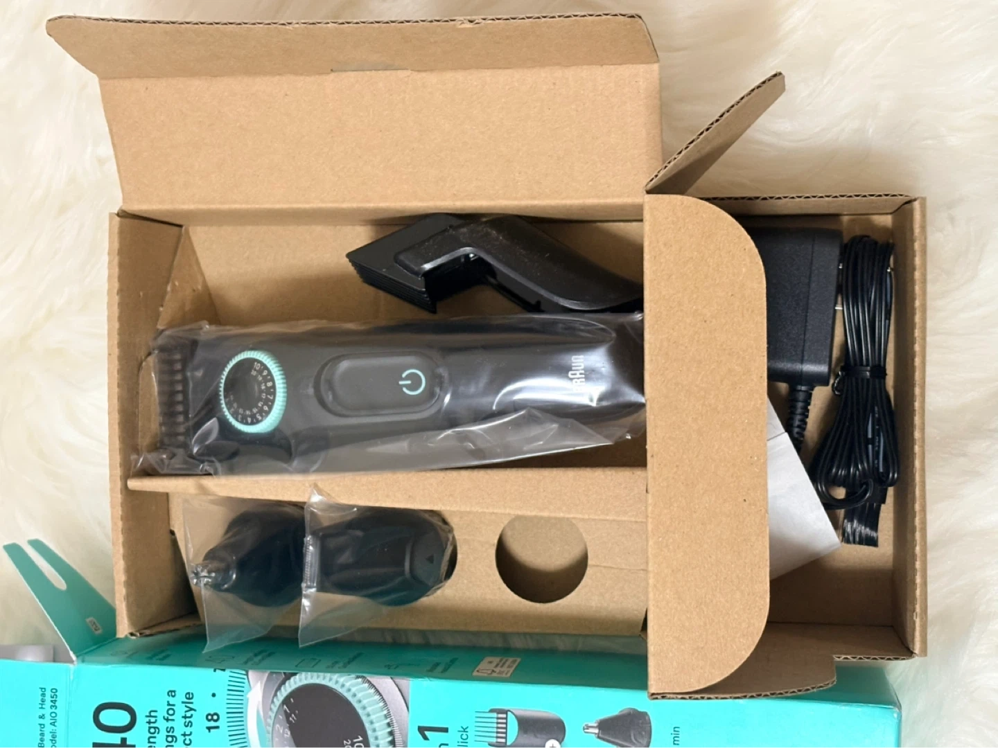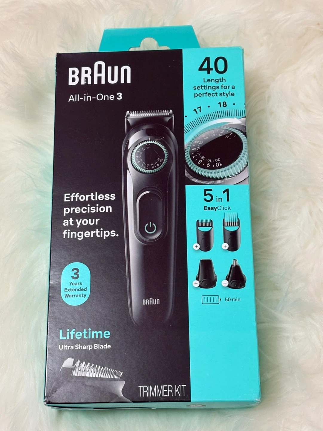 Braun All-in-One 3 trimmer kit for effortless precision. It has 40 length settings from 0.5 mm to 20 mm with 0.5 mm precise steps. Includes 4 pieces and the charger.