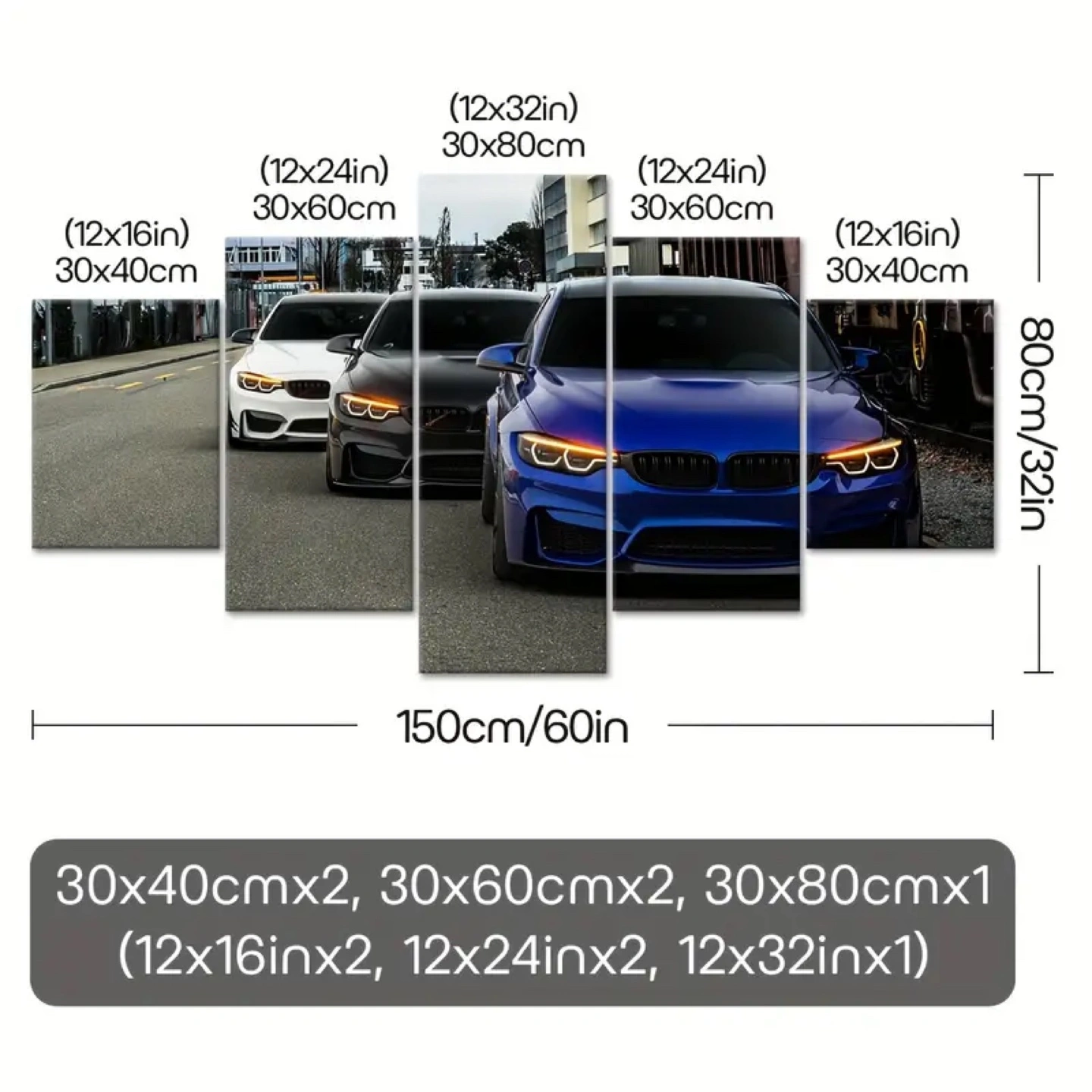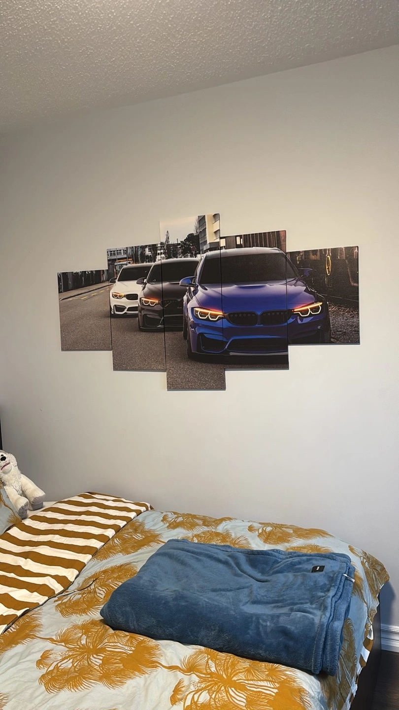 Five piece canvas wall art featuring a blue BMW, a black BMW, and a white BMW. The canvas is stretched and framed and comes with easy to hang hardware.