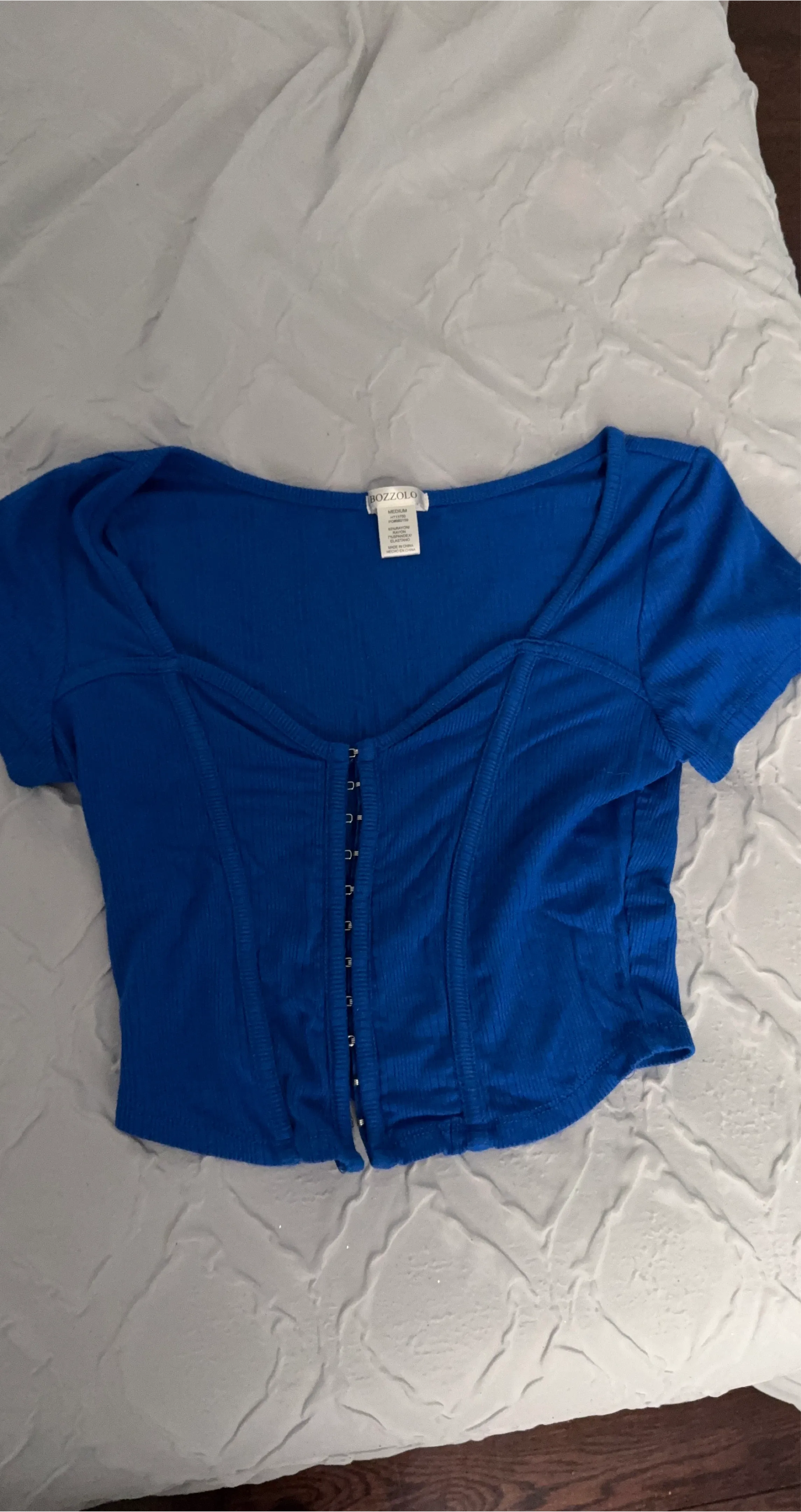 Bozzolo blue ribbed corset top. It's a size medium with hook-and-eye front closure. Made with rayon and spandex blend for a comfy fit.
