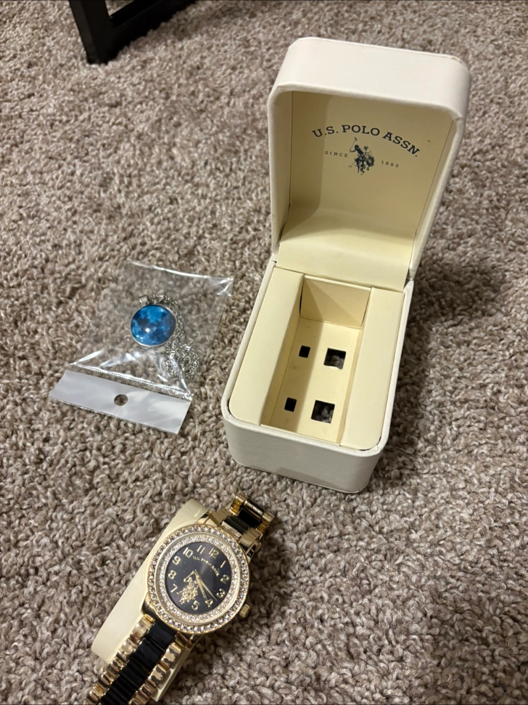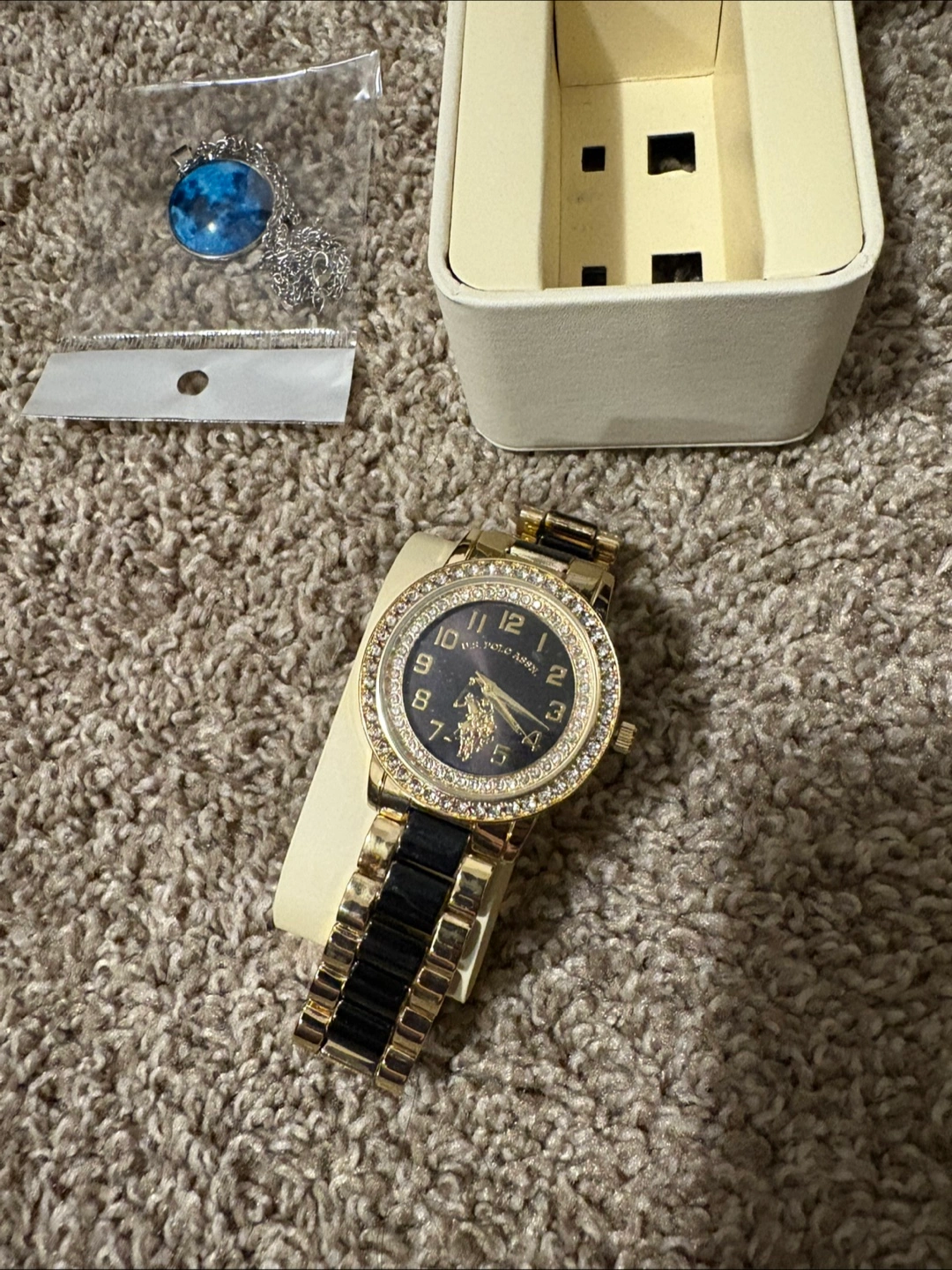 Selling a U.S. Polo Assn. watch with a black and gold band. It comes with a necklace and the original box