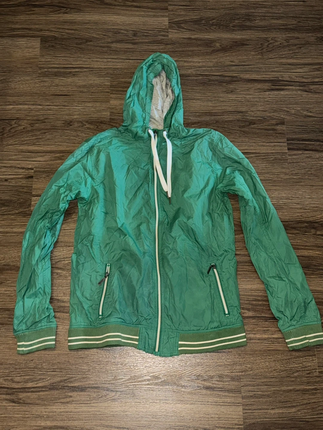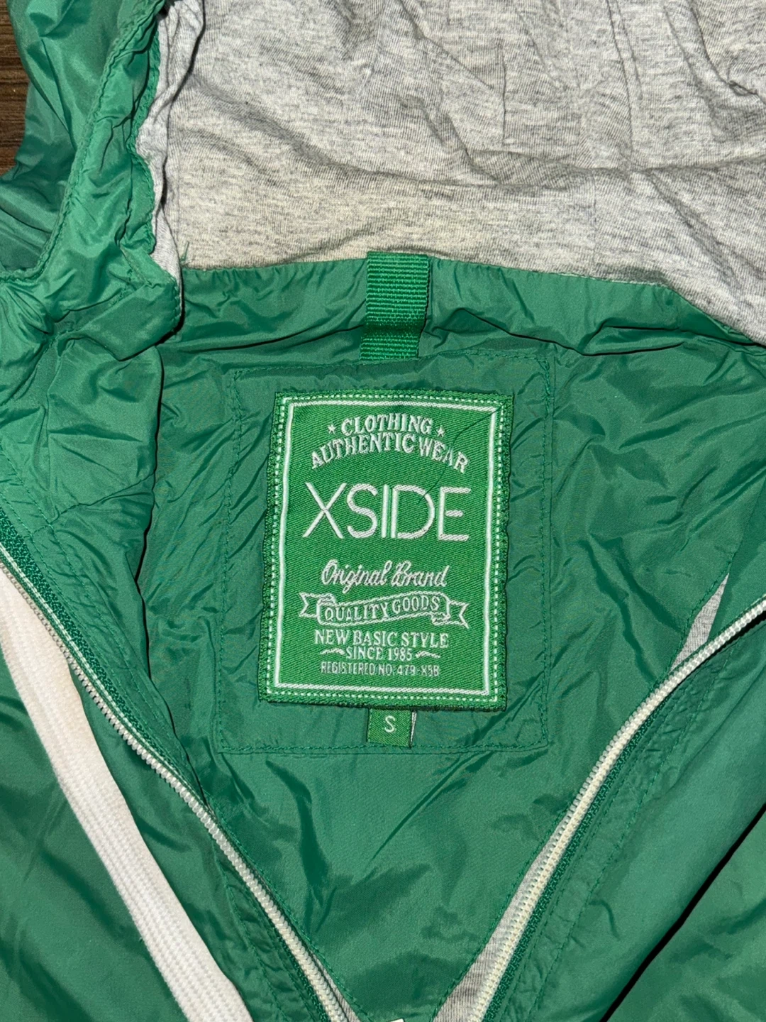 Green hooded jacket from Xside, size S. Features a full zip front and two zippered pockets.