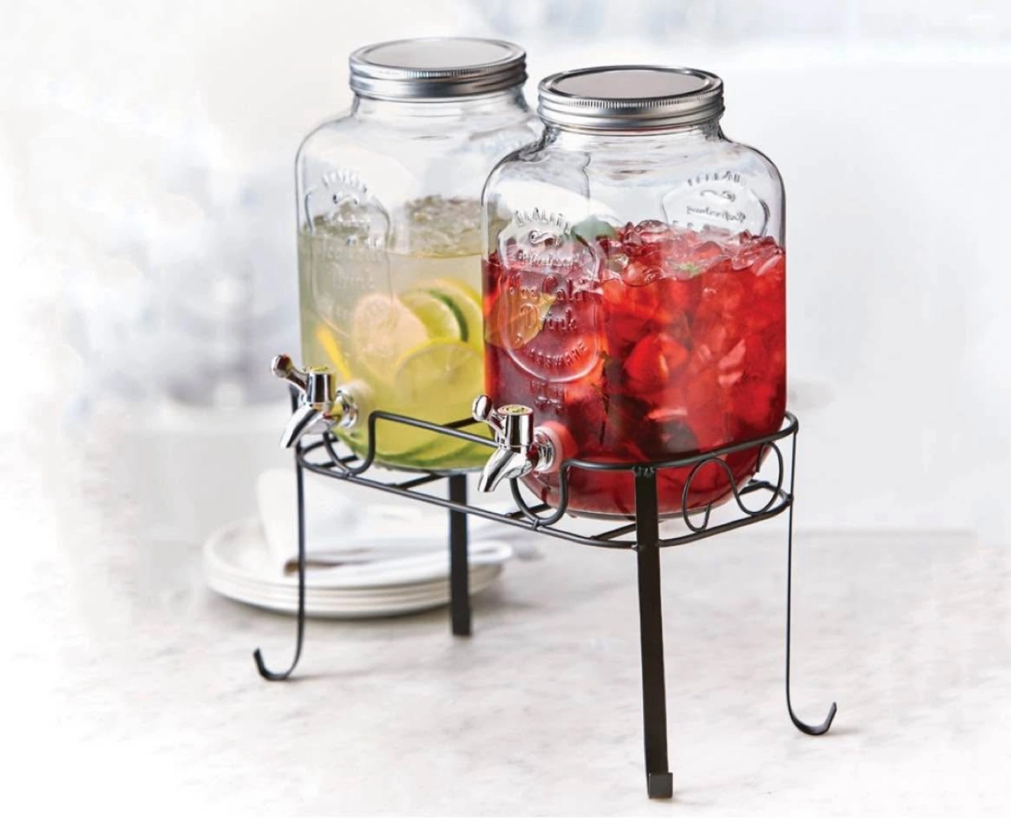 Selling a Mason Craft & More drink dispenser set! It includes two glass dispensers with metal lids and spouts, sitting on a black metal stand. Perfect for parties or gatherings! Used only once. In original boxes. I have 2 sets available 25$ each.