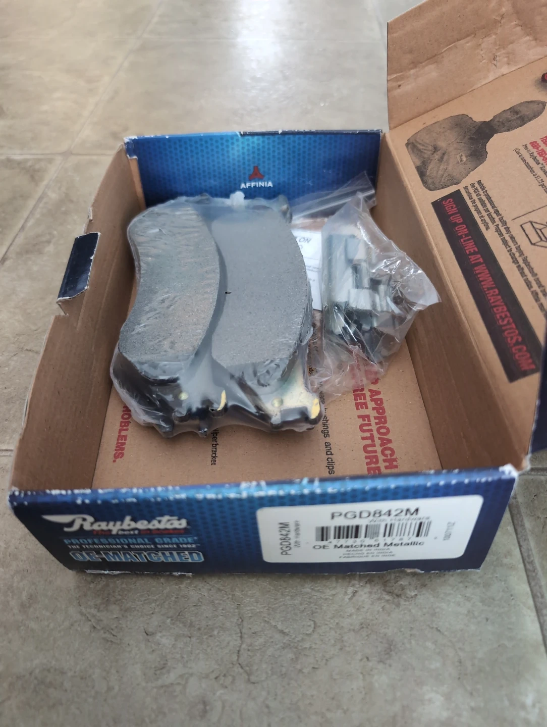 Raybestos PGD842M brake pads in OE Matched Metallic. Includes hardware for installation. These are professional grade brake pads engineered to restore factory performance.