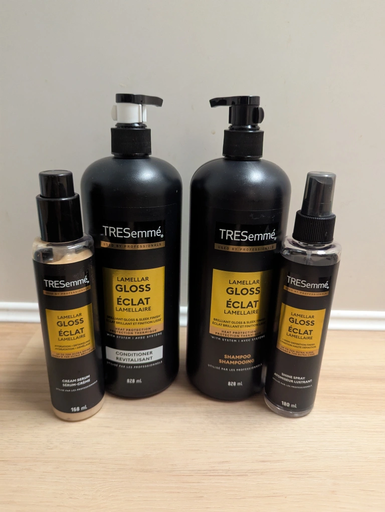 Full set of TRESemmé Lamellar Gloss products. Includes shampoo, conditioner, and shine spray. Cream serum also included. New, unused.