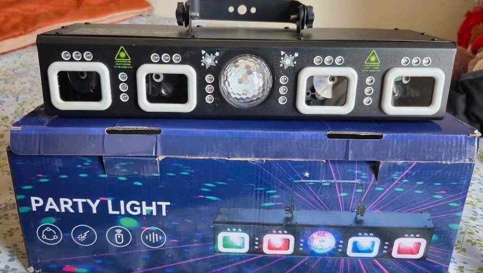 This is a Pro 6-in-1 DMX light machine with sound-activated laser show, disco ball light, RGBW and UV strobe effects. Great for indoor parties, raves, clubs, dances, bars, concerts, and DJ events.