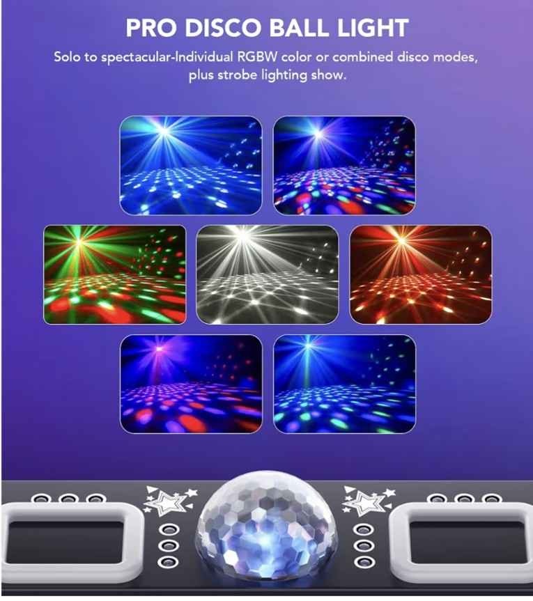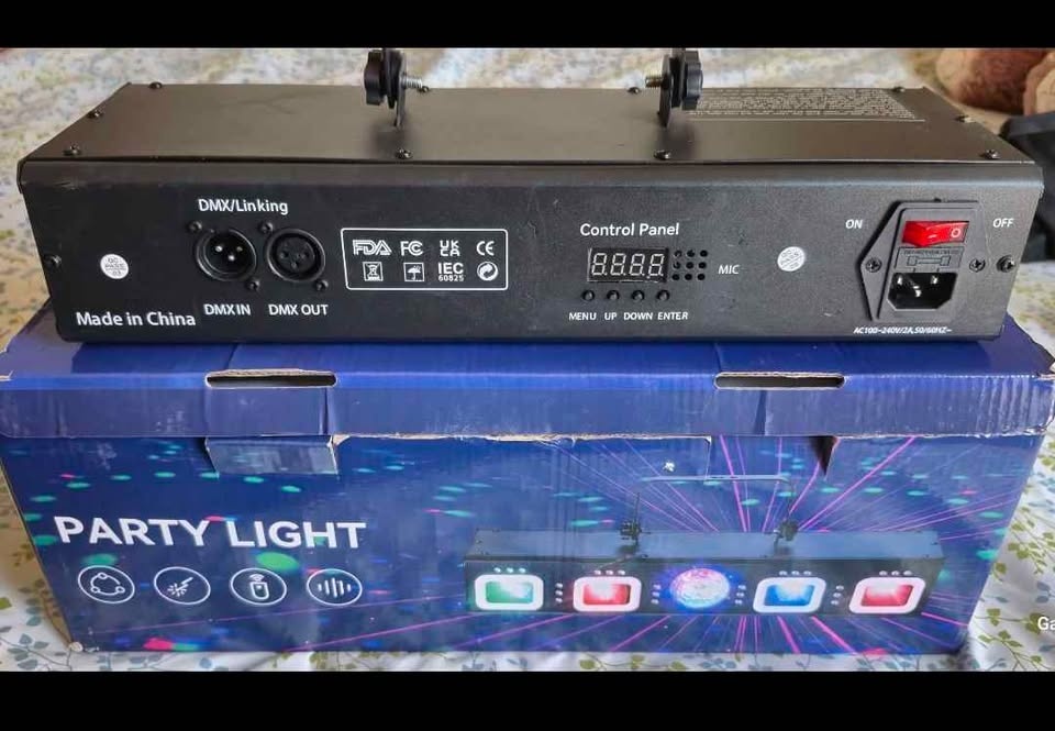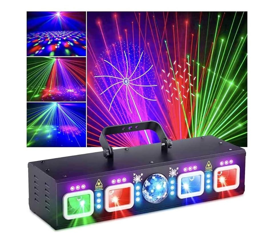 This is a Pro 6-in-1 DMX light machine with sound-activated laser show, disco ball light, RGBW and UV strobe effects. Great for indoor parties, raves, clubs, dances, bars, concerts, and DJ events.