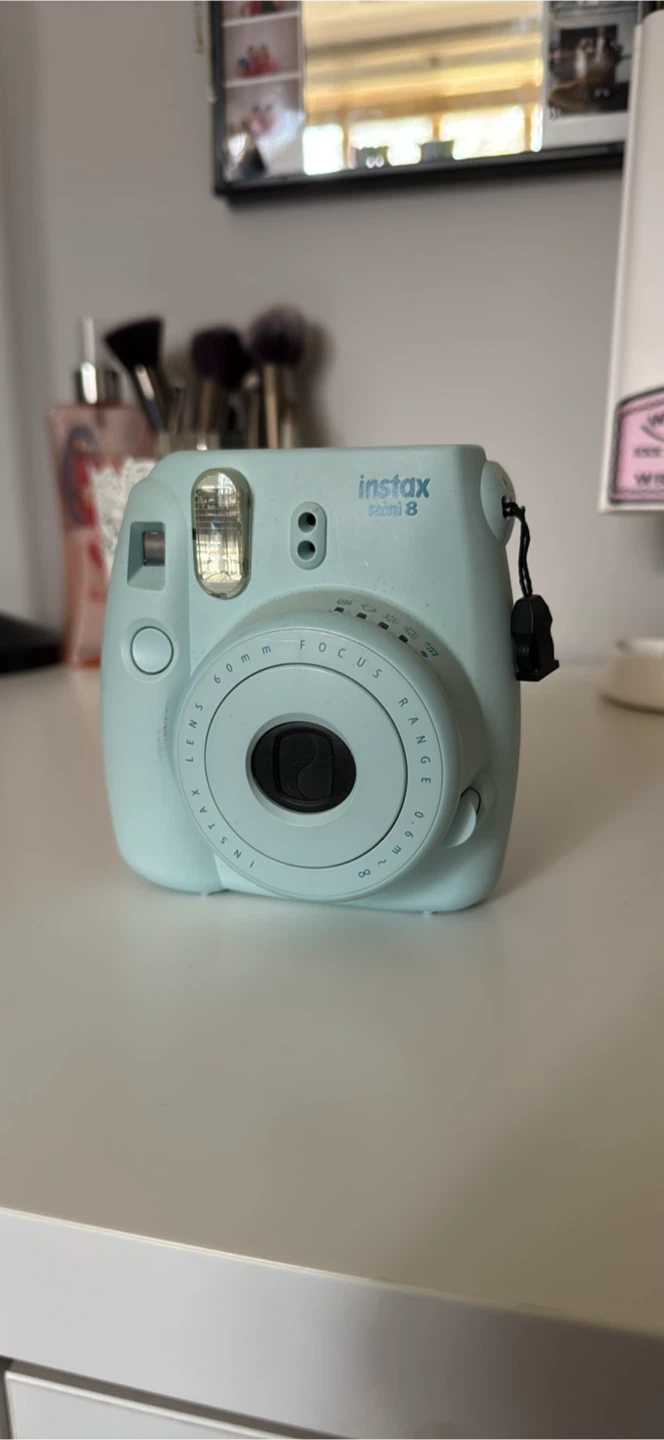 Fujifilm Instax Mini 8 instant camera in a mint colour. It's got a 60mm lens and auto flash. Fun and easy to use for instant memories!