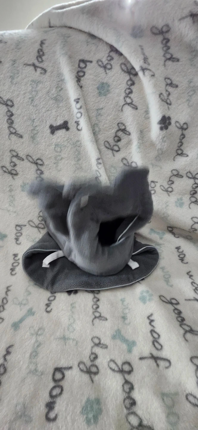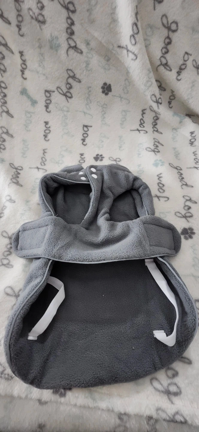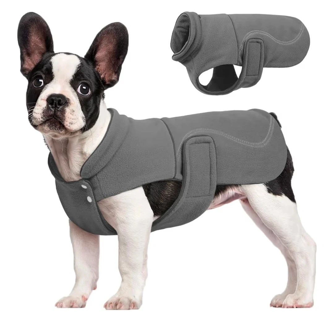 This grey fleece dog coat is designed for warmth and comfort. It features a soft fleece material and easy-to-use hook-and-loop closures. It's perfect for keeping your small dog cozy.