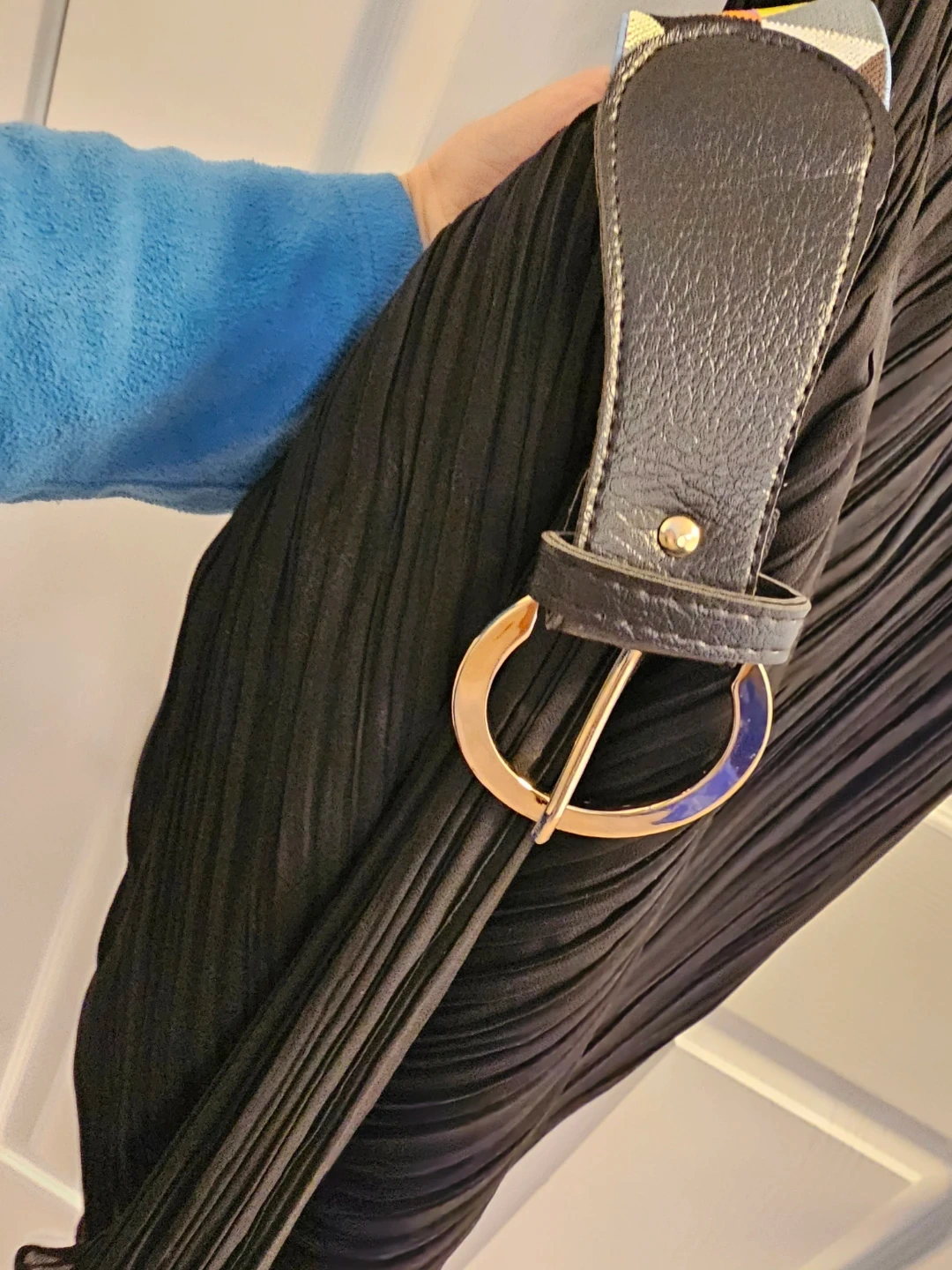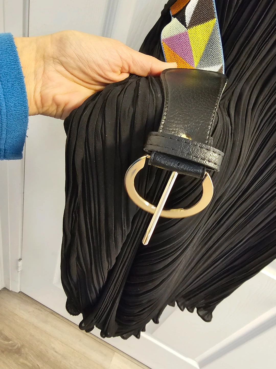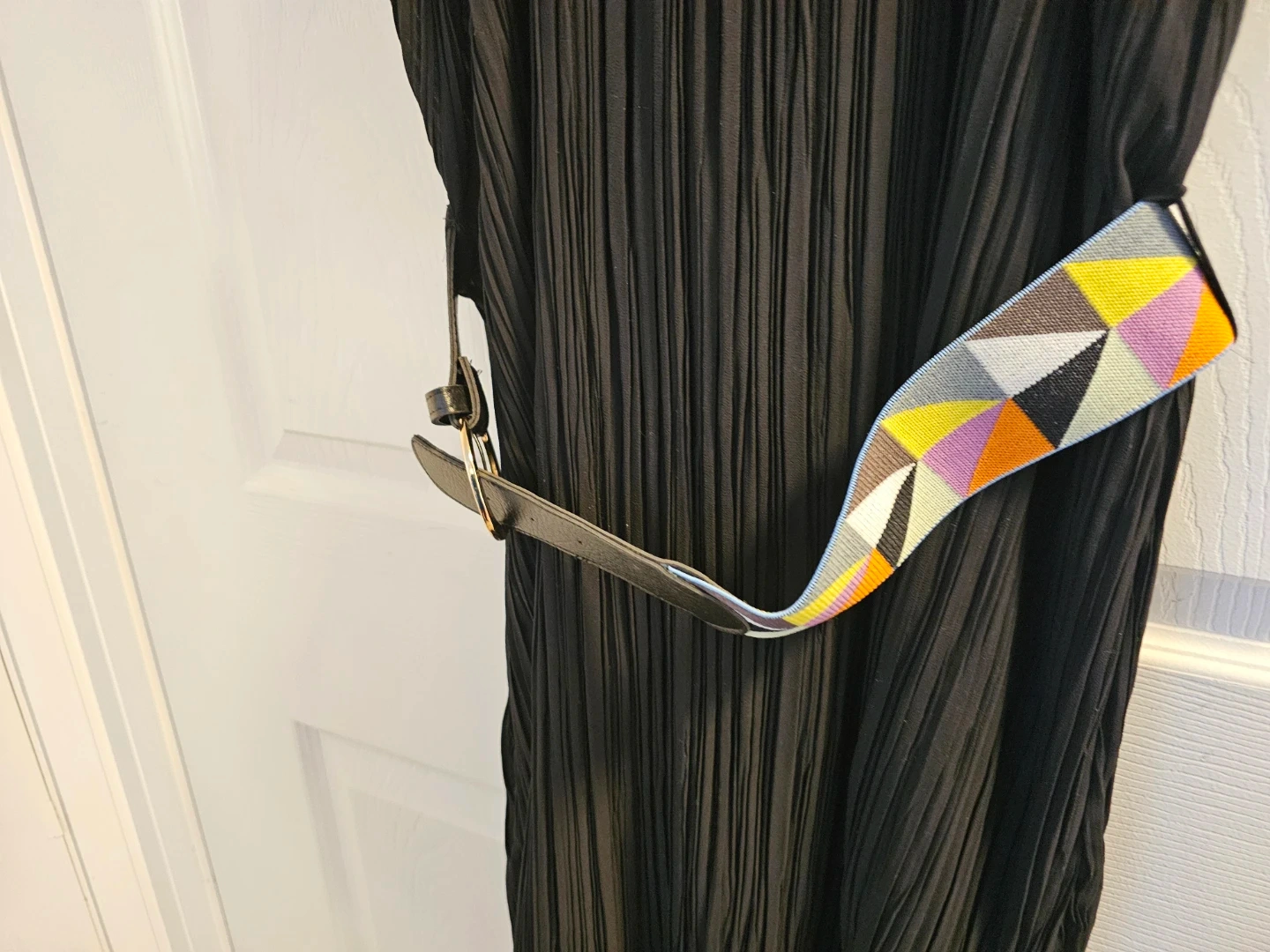 Black Pleated Midi Dress with Geometric Belt