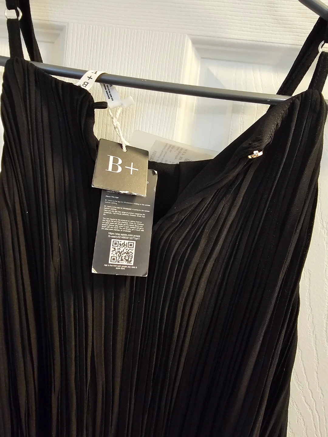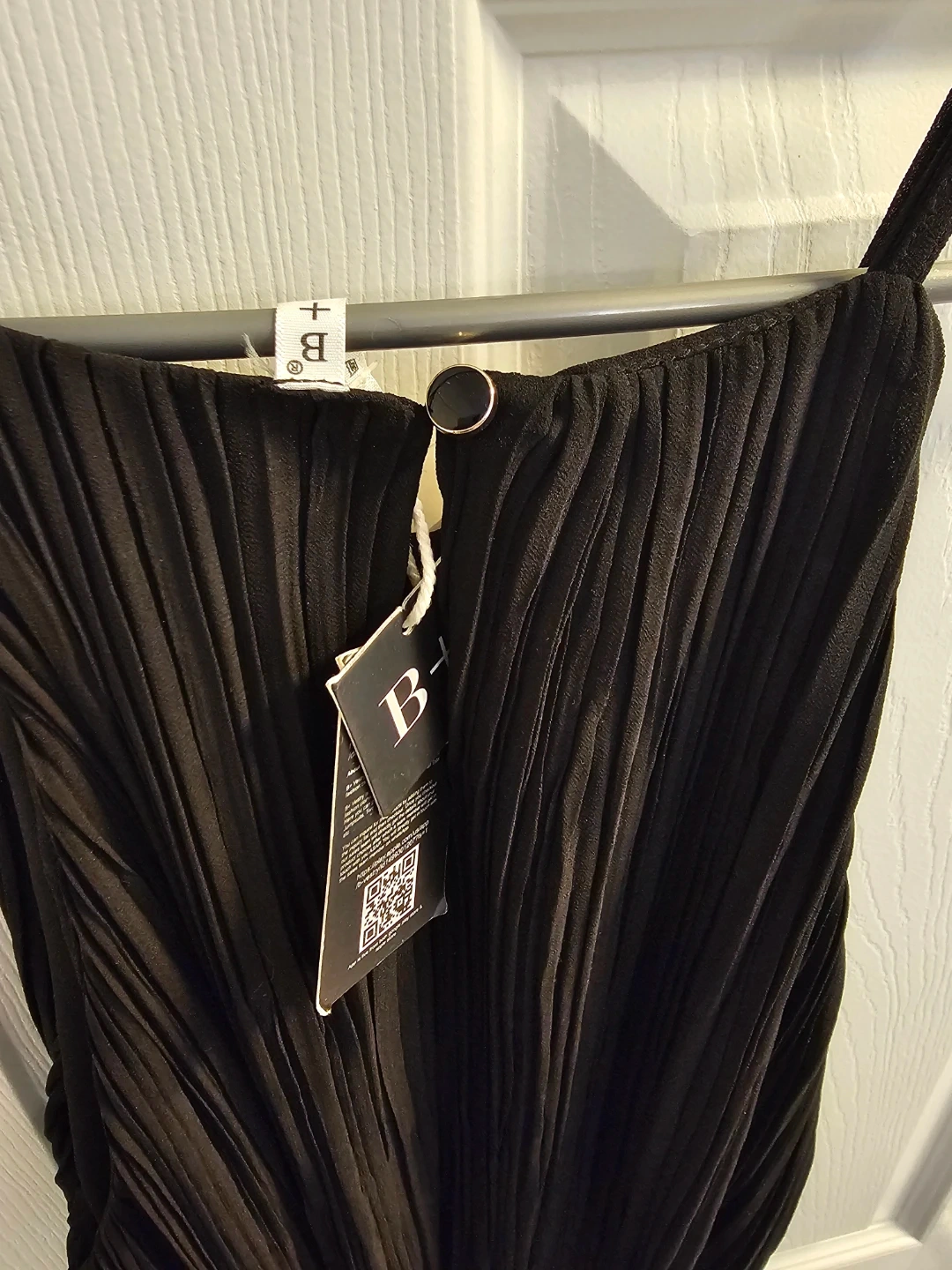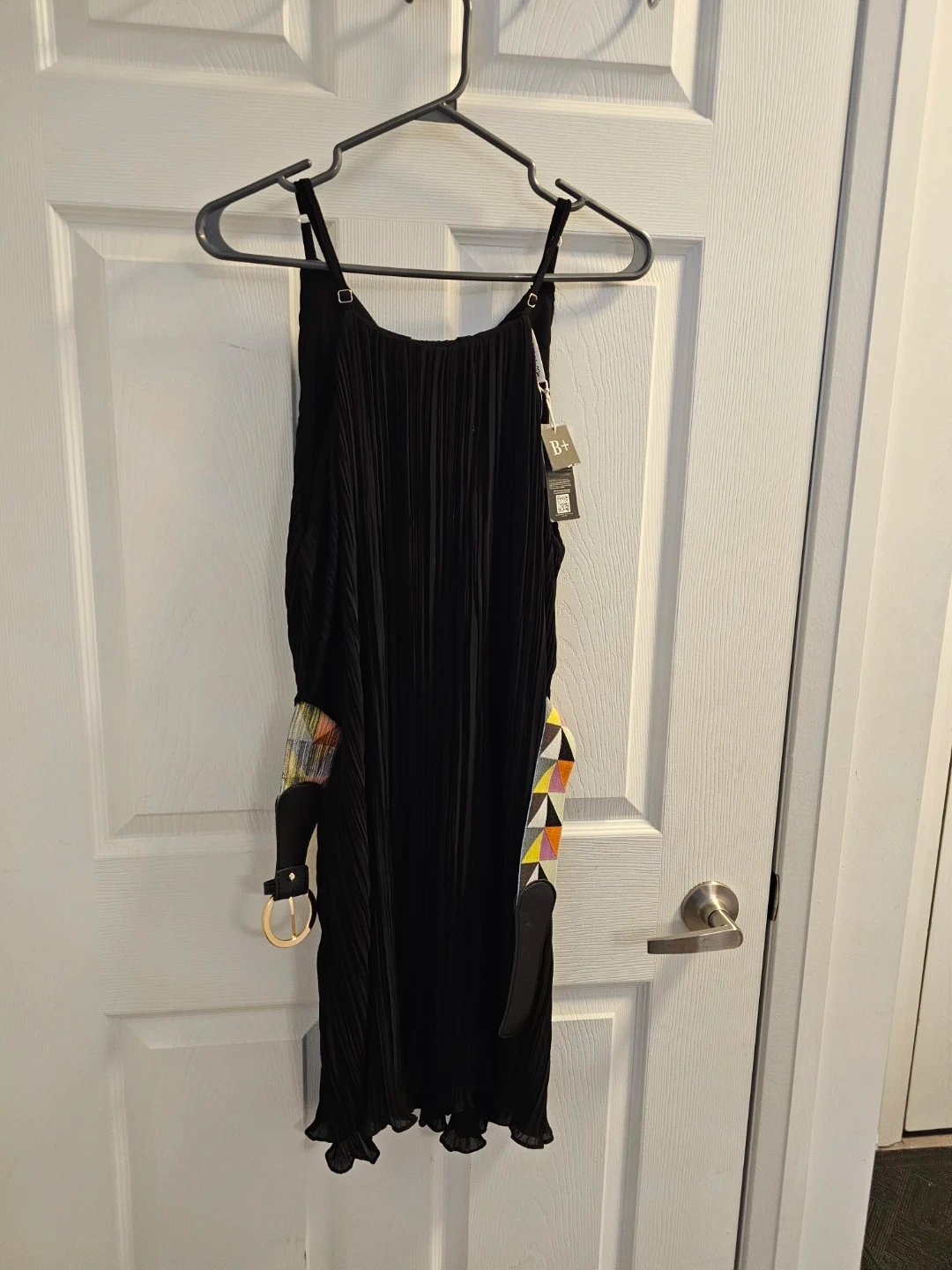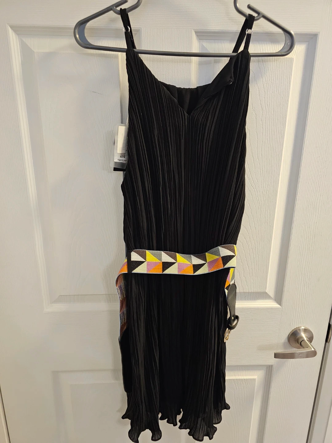 This black midi dress features a pleated design and comes with a stylish geometric patterned belt. It's made from a lightweight fabric, perfect for various occasions. The adjustable straps ensure a comfortable fit.