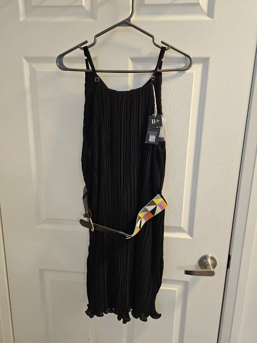 This black midi dress features a pleated design and comes with a stylish geometric patterned belt. It's made from a lightweight fabric, perfect for various occasions. The adjustable straps ensure a comfortable fit.