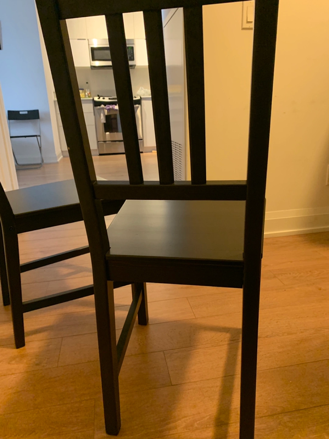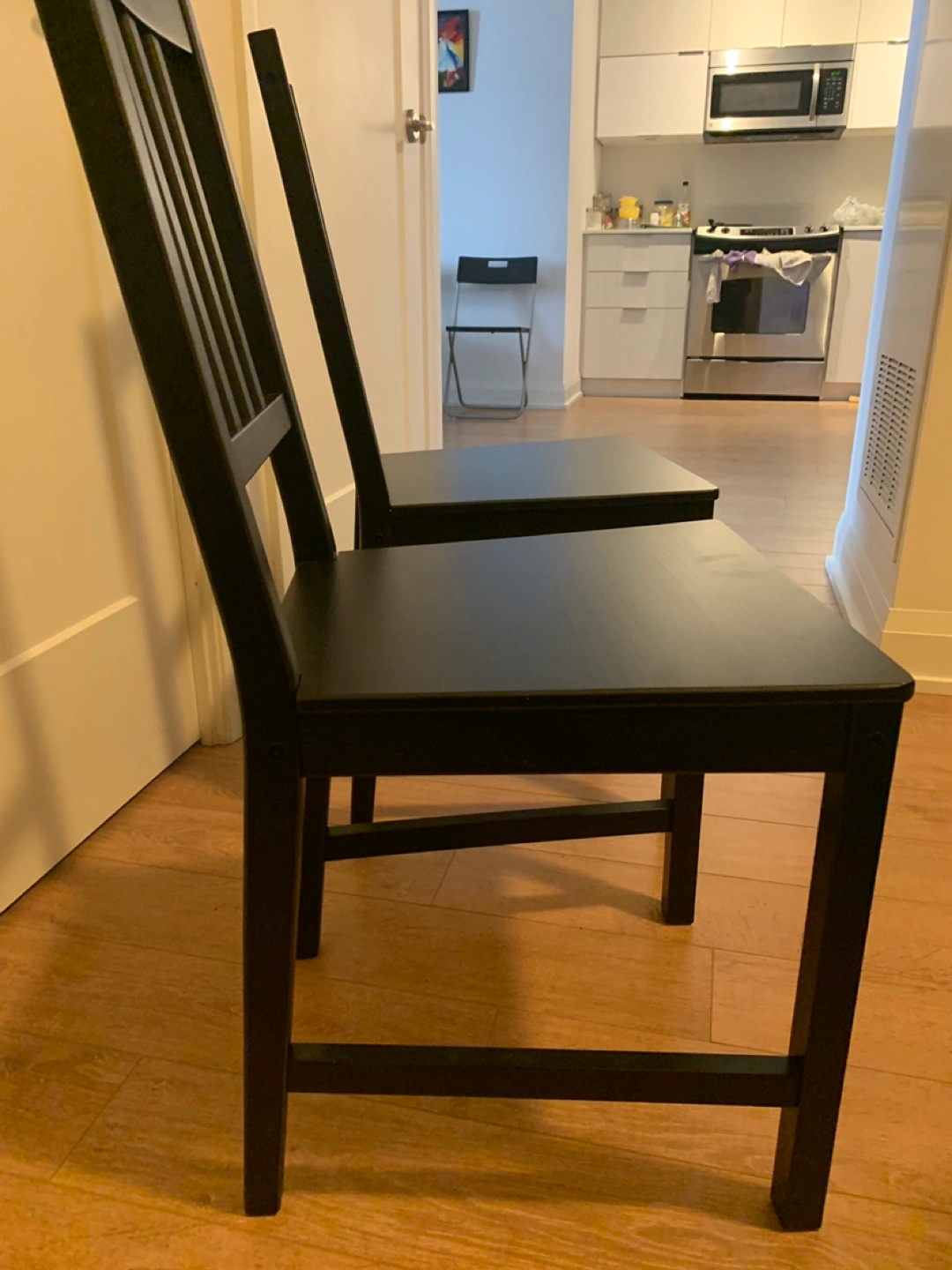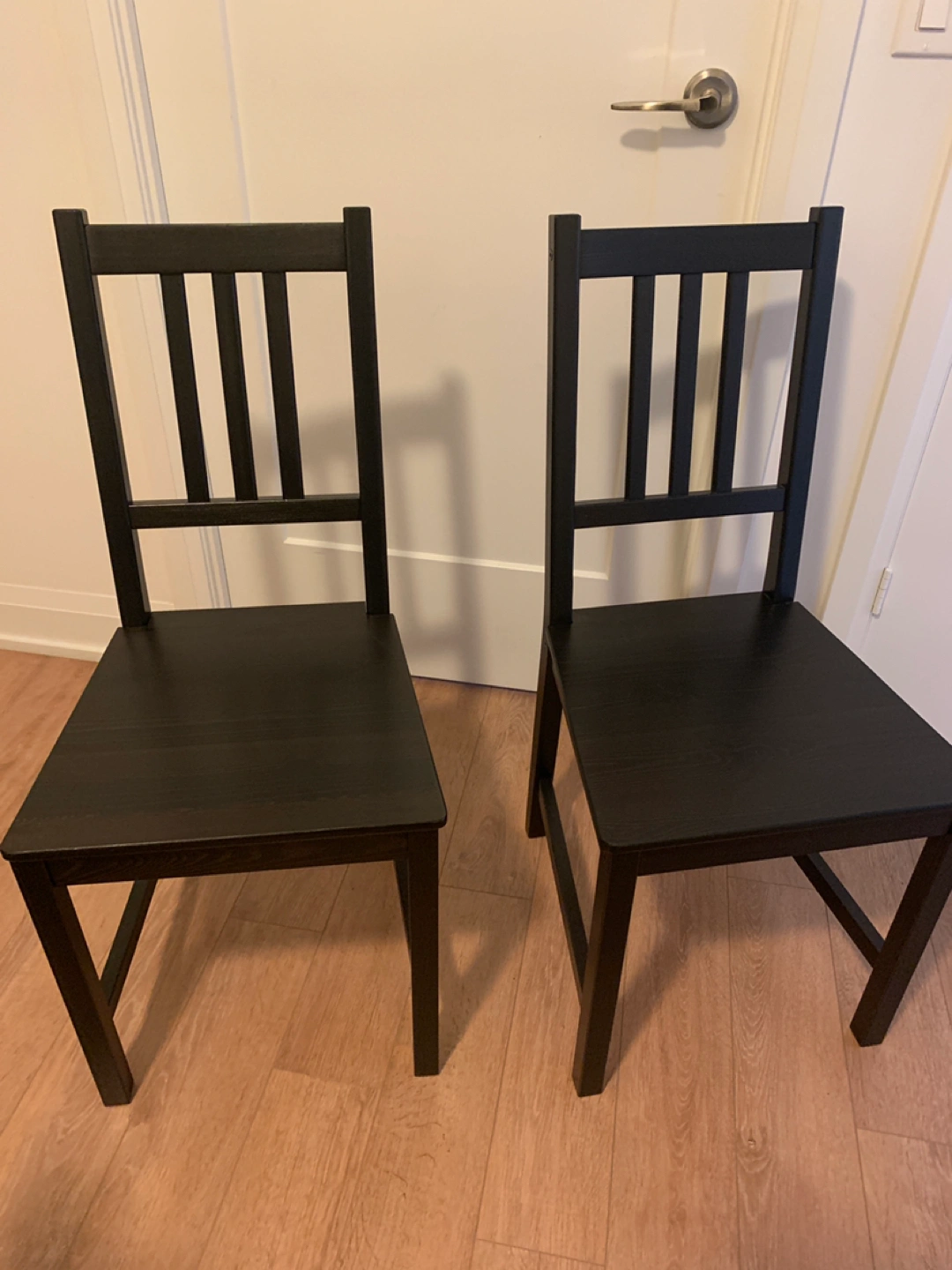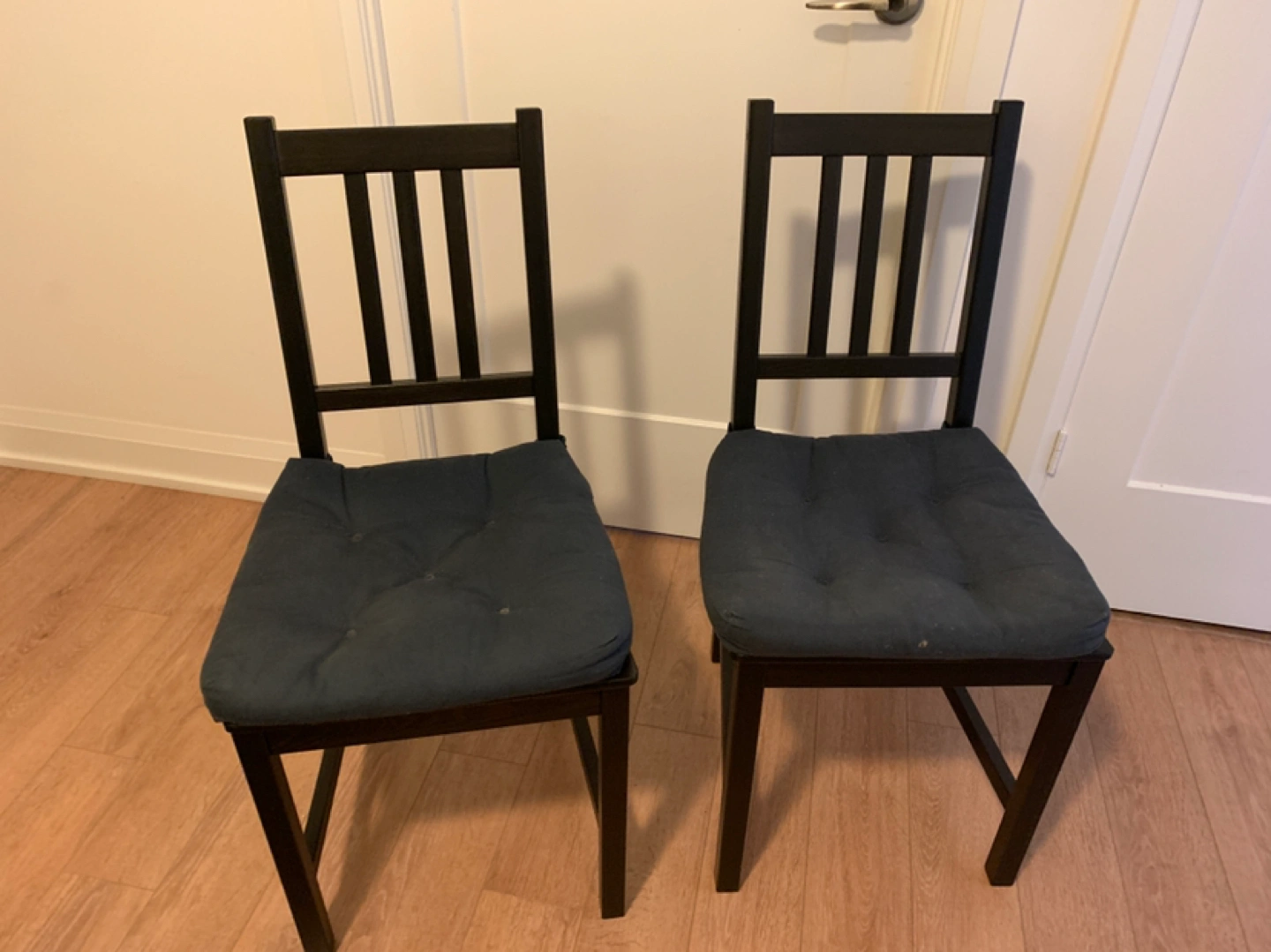 Moving out sale. A set of two dining chairs from ikea in good condition. Chair cushions included, although there are worn. Pick up only.