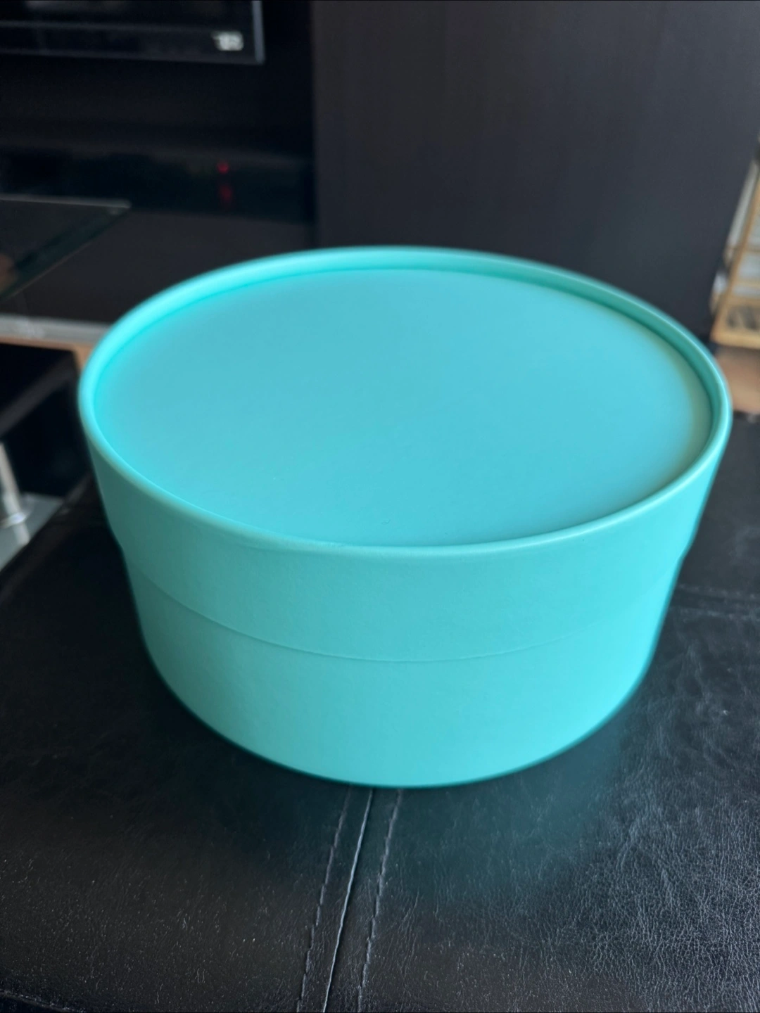 Large blue round hat/gift box. Brand new condition. Never been used. Bought it but no longer need it.