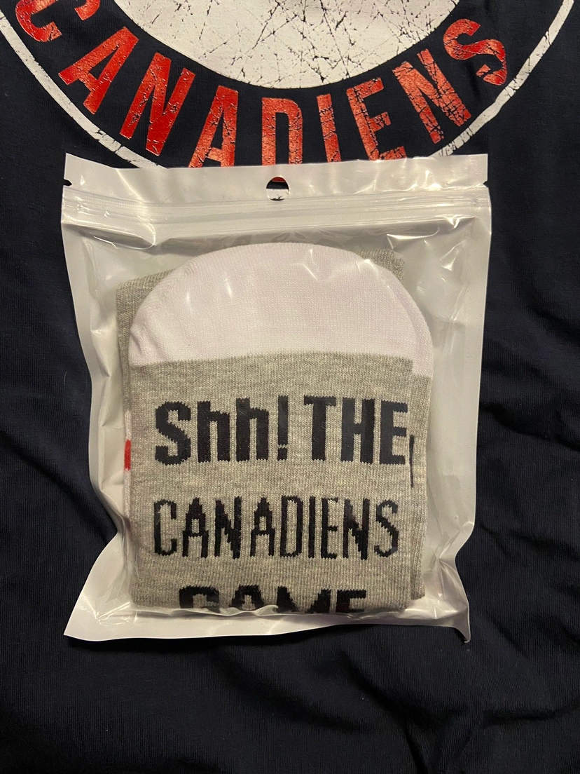 A Montreal Canadiens T-shirt and a pair of socks. The T-shirt is navy blue with the Montreal Canadiens logo in white, red and blue. The socks are grey with black details.
