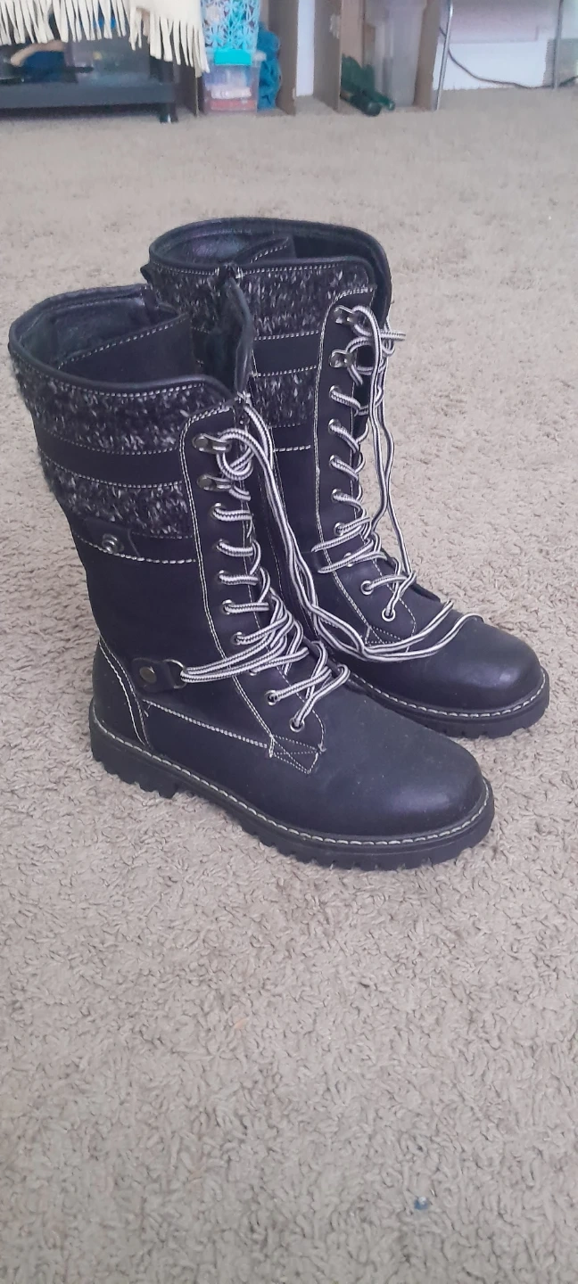 These black lace-up boots feature a stylish knit cuff for added warmth and texture. They have a sturdy sole and a classic combat boot design. Perfect for chilly weather!
