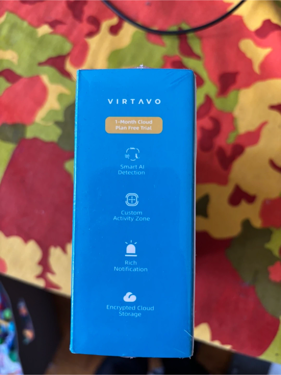 Selling a brand new VIRTAVO Starlight Security Camera, still in its original packaging! This camera features ultra full color night vision and is designed to be battery-powered, wireless, and weatherproof. It also works with Alexa. The box also mentions a 1-month cloud plan free trial, smart AI detection, custom activity zone, rich notifications, and encrypted cloud storage