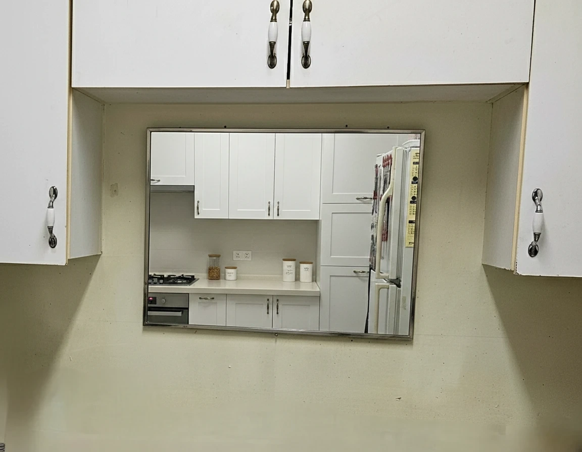 A rectangular wall mirror with a simple metal frame. It's ideal for adding a reflective surface to any room. The back is made of galvanized metal for durability.
