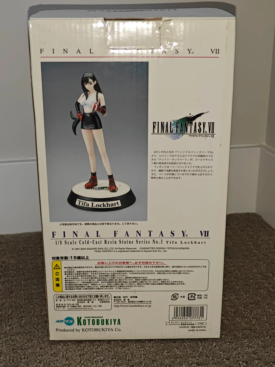 I am selling a Final Fantasy VII - No. 3 Tifa Lockhart 1/8 Scale Cold-Cast Resin Statue Series Action Figures FF 7 in like-new condition. Mainly sat in the box. Produced by Kotobukiya Company / 2004 Square ENIX Co. Purchased in Japan. This authentic and officially licensed figure was produced in collaboration with Square Enix Co. in 2004, making it a highly sought-after collectible for any dedicated Final Fantasy enthusiast.