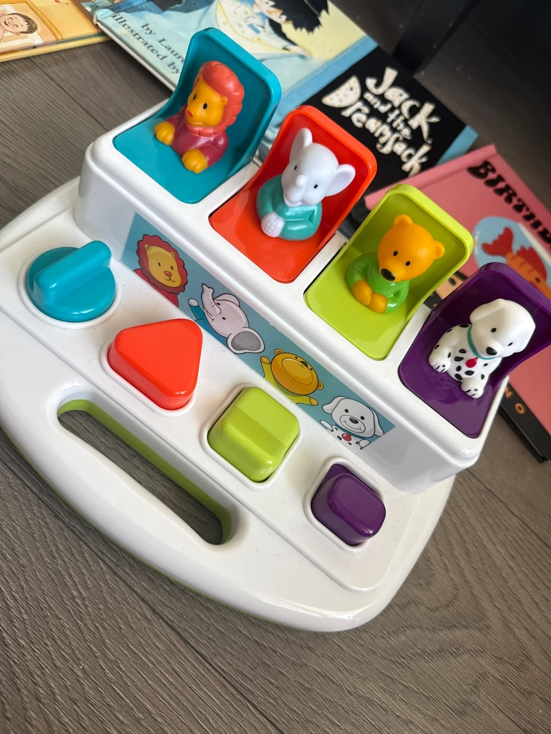 and 'The Birthday Fish'. Toys are made of plastic and wood.