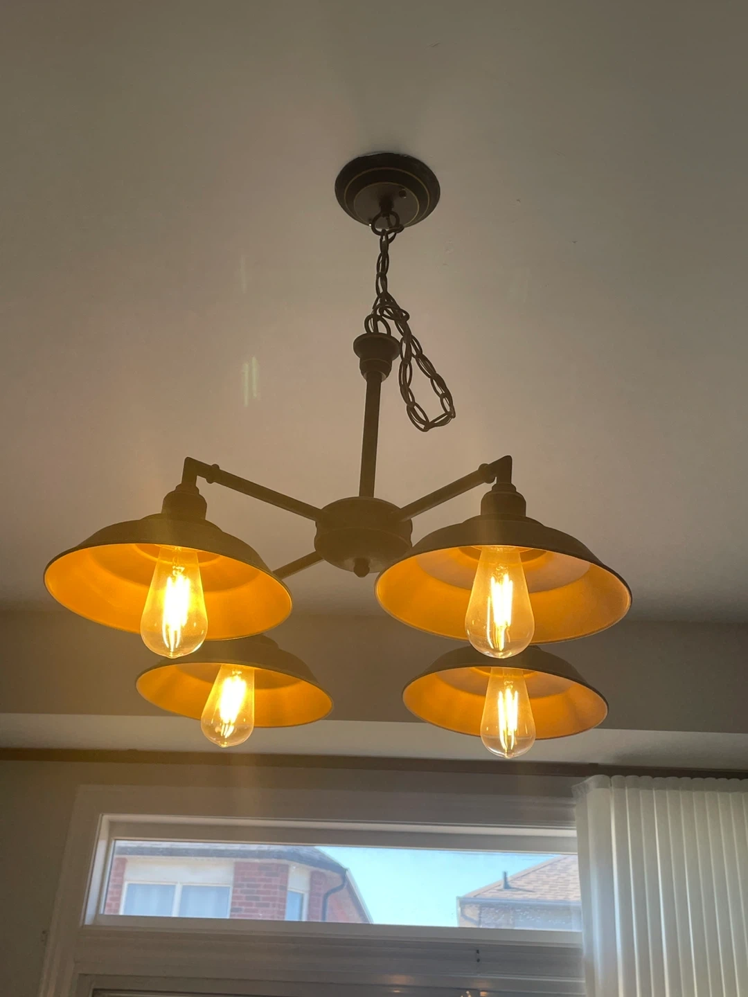 This four-light chandelier features a rustic, industrial design with metal shades. It's perfect for adding a vintage touch to any room. Includes all necessary mounting hardware.