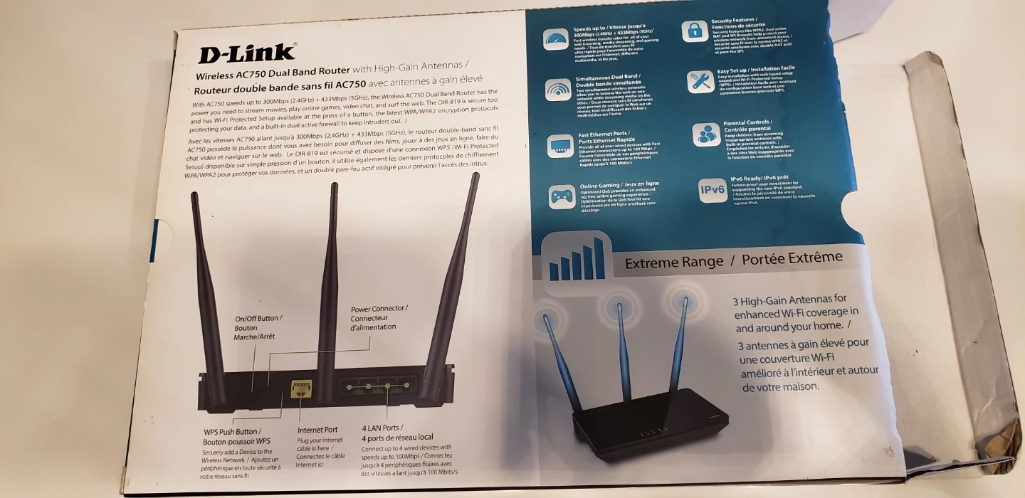 Selling a D-Link DIR-819 Wireless AC750 Dual Band Router with High-Gain Antennas. It's in great shape and comes with the box. The router features: