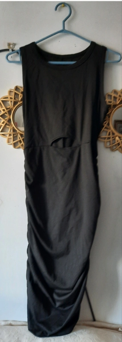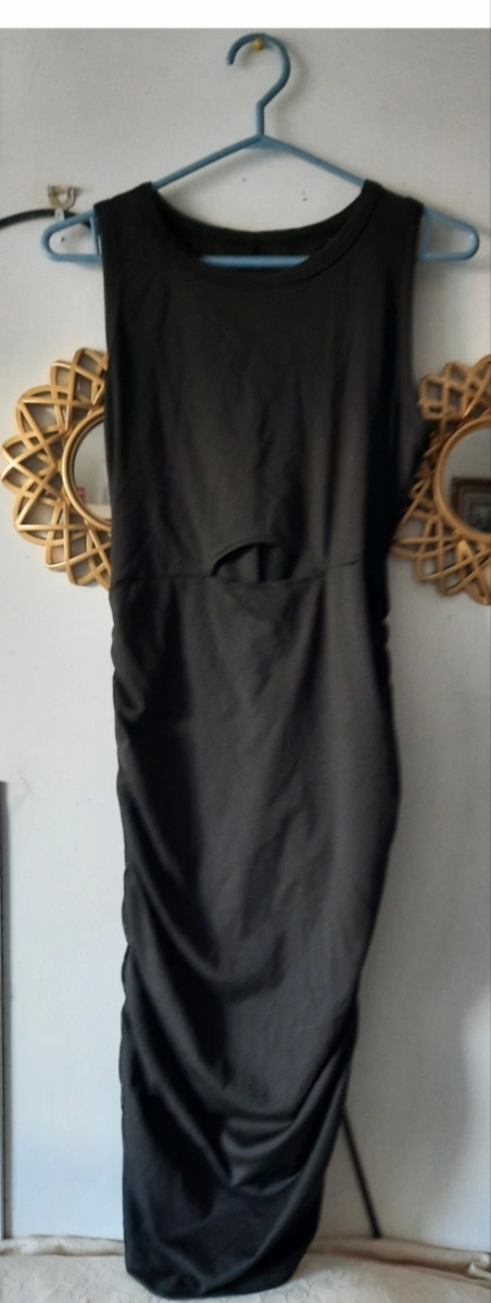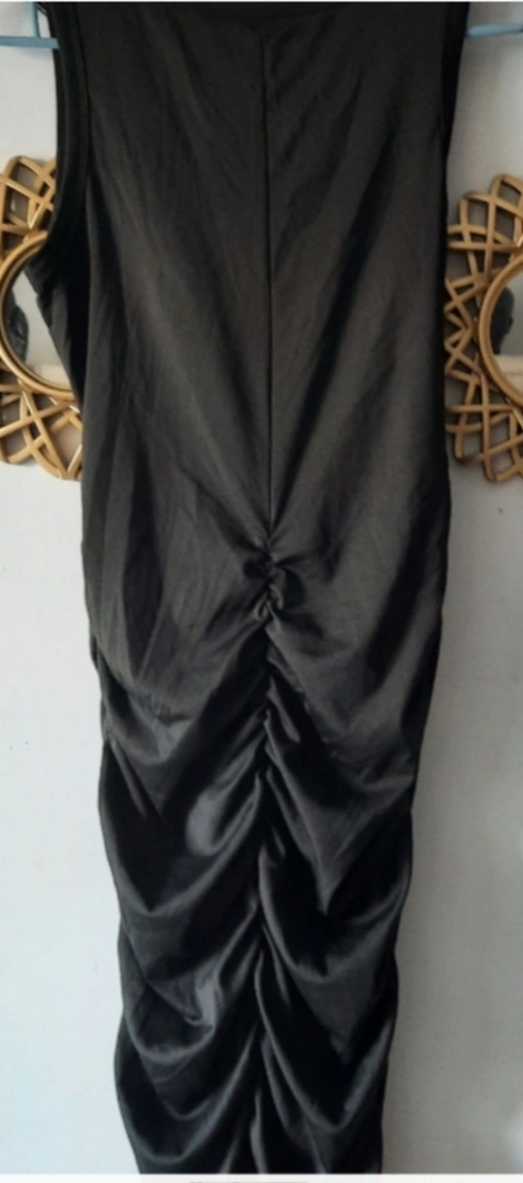 Sleek black midi dress. Features ruched detailing and a keyhole cutout. Sleeveless design. Perfect for a night out. Never worn