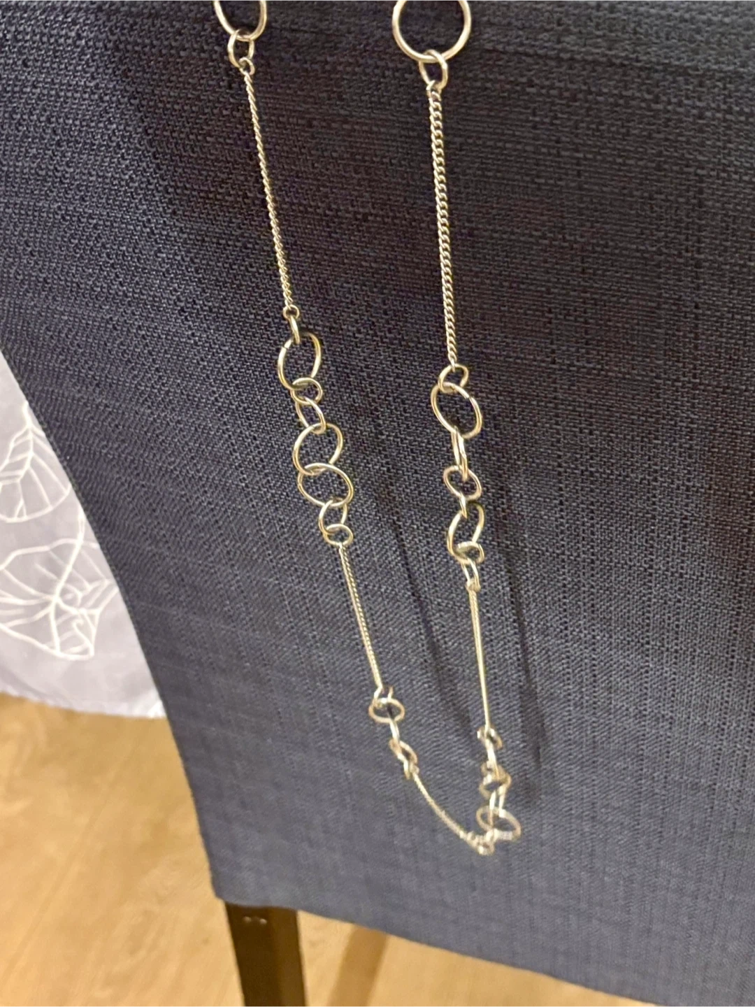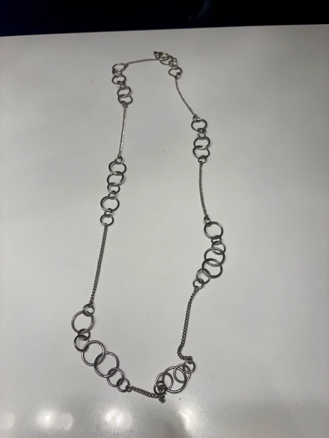 This is a stylish silver-tone necklace featuring a long link chain design. It has a unique arrangement of interconnected rings throughout its length. The necklace is made of metal and comes with a secure clasp.