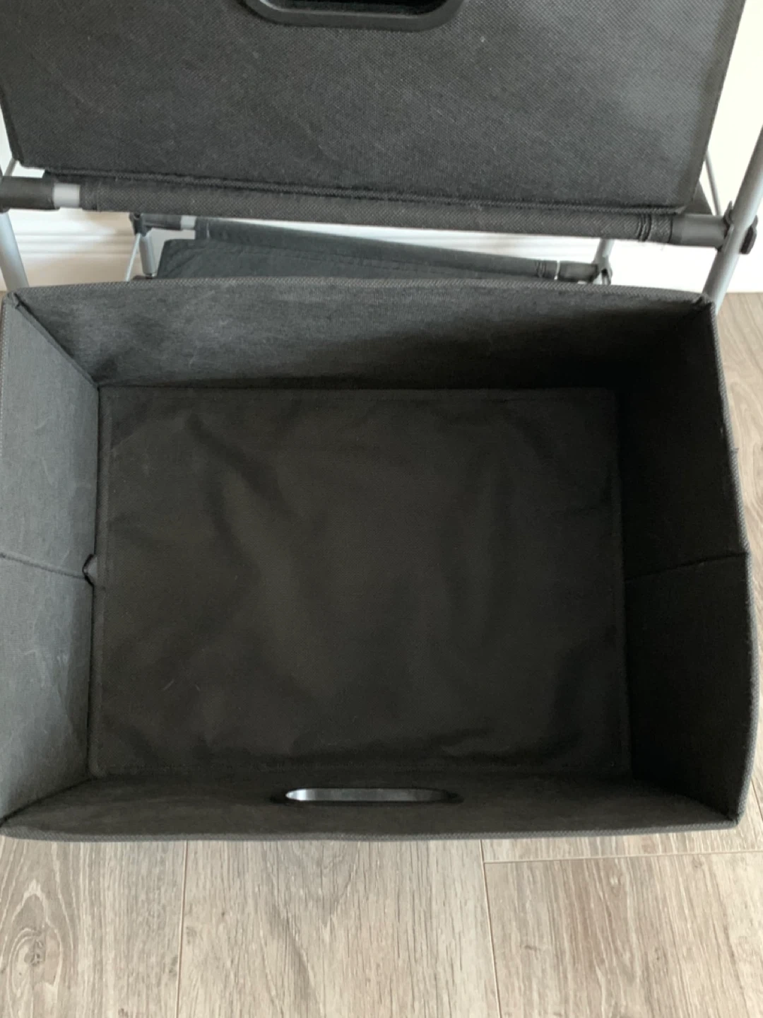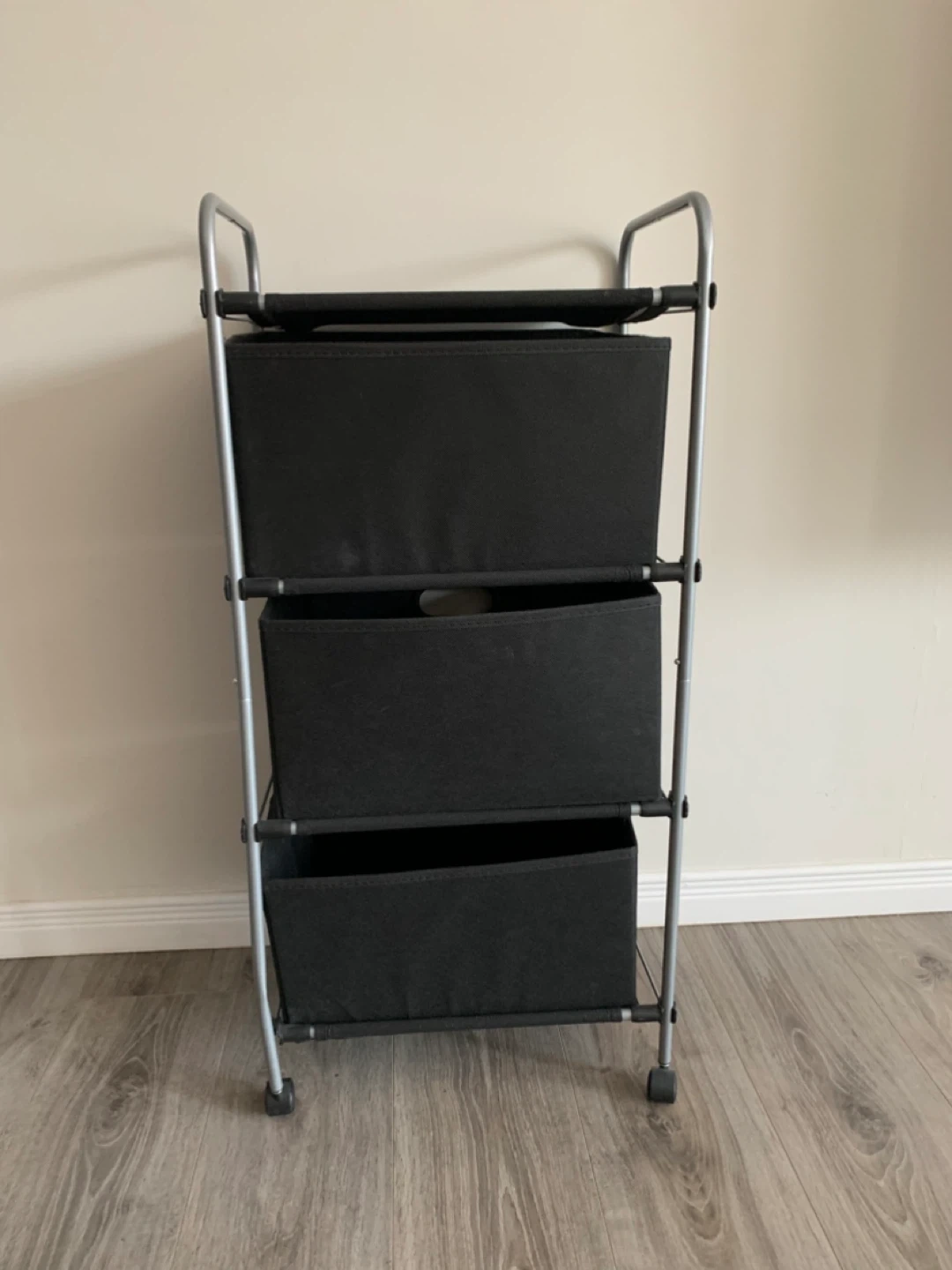 This 3-drawer storage cart is black and comes with wheels for easy transport. It's made with a metal frame and fabric drawers. It's useful for organizing clothes, toys, or other household items.