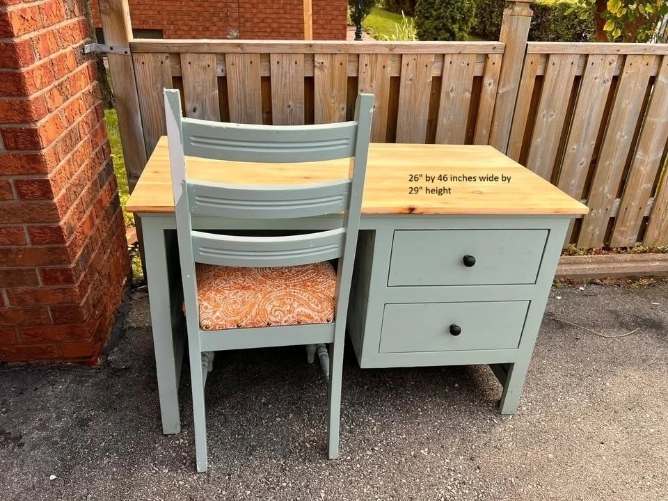 Chair and desk are not ikea....they are solid wood Made in Canada. Very good quality...paint is peeling on chair, can be easily fixed. Also button down style chair. Comes from a smoke and pet free home.