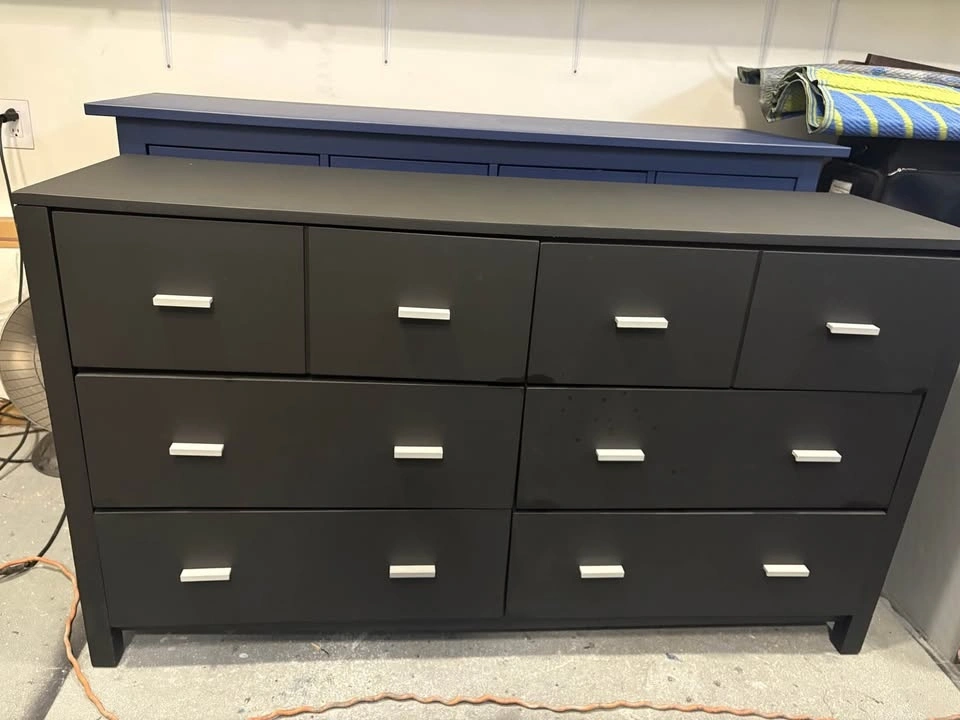 Beautiful Black Dresser with silver knobs made from solid wood. Refinished in a flat black with silver handles. Timeless style with generous storage. Good, solid, sturdy, and well finished. Drawers open and close smoothly. Solid wood construction, coated in 2 coats of polyurethane, refinished in durable furniture paint. Multiple spacious drawers. Approx. standard double dresser size (34.5” H x 60” W 18” D). Cash or etransfer accepted. Pickup: North Delta. Let me know if you're interested!