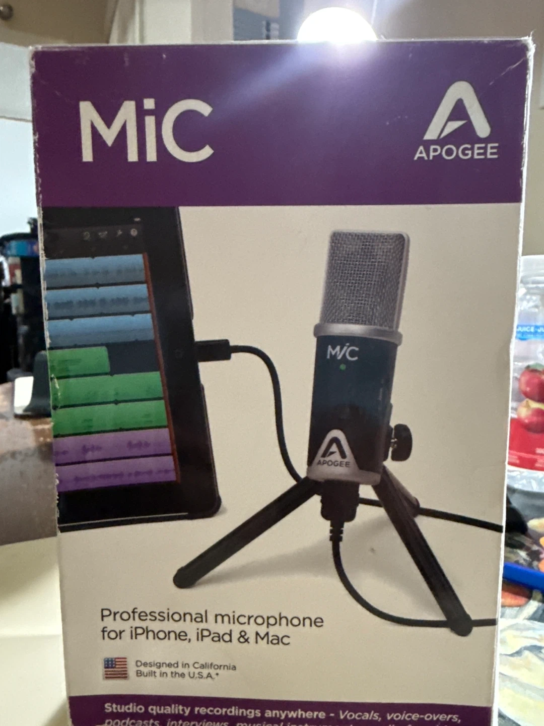 Selling an Apogee MiC, a professional microphone designed for iPhone, iPad, and Mac. It's in great condition and comes with the original box. The MiC features a studio-quality microphone capsule with a steel mesh housing and an all-metal, die-cast zinc body. It has a gain control knob for easy adjustment and a multicolor LED to indicate input level and device status. It's easy to connect using Lightning & USB cables, which are included