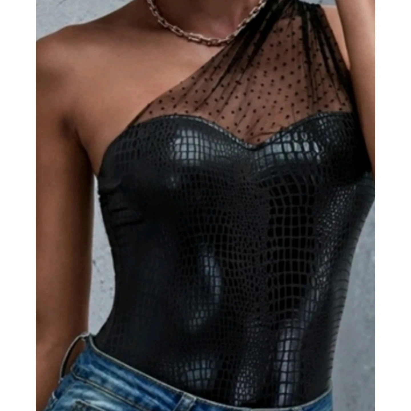 This striking black top features a one-shoulder design with sheer mesh overlay adorned with polka dots. It has a fitted bodice with a faux crocodile texture for a bold look. It's made of polyester and spandex for a comfortable fit.